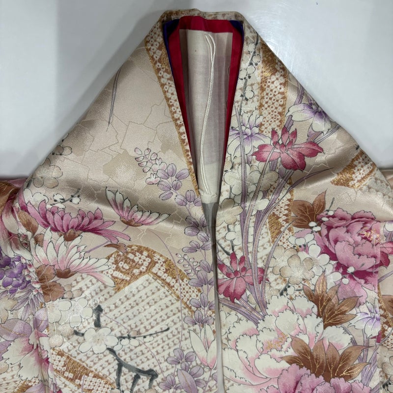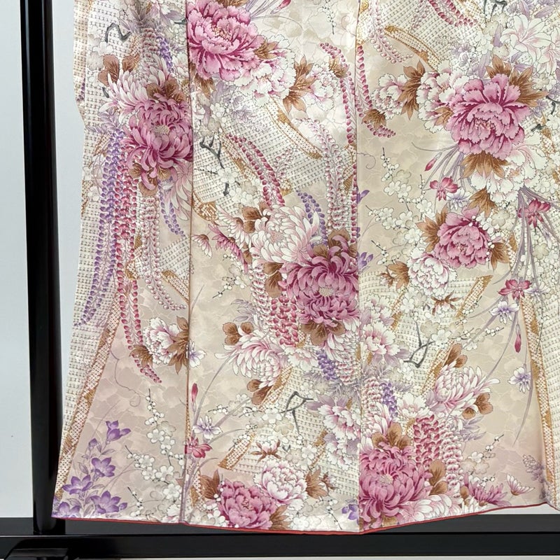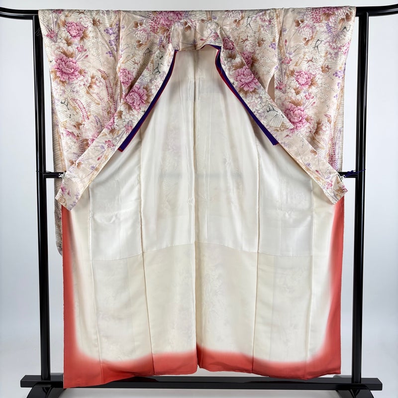 【振袖】 赤系 ピンクベージュ 秀品 A 約150cm~約159cm 裄丈63cm-64cm (S)size 袖丈91cm以上 9990-29990 美品 二万以下