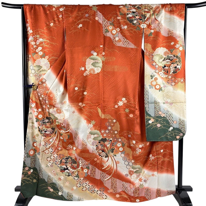 【着物ランク】秀品 【素材】正絹 【身丈】約162.5cm 【裄丈】約66cm 【袖丈】約112.5cm 【袖幅】約33.5cm 【前幅】約24.5cm 【後幅】約29.5cm 【サイズ】M 【着物仕立て】袷 【着用時期】10~5月 【状態ランク】ランクA 【着物着用シーン】成人式、謝恩会