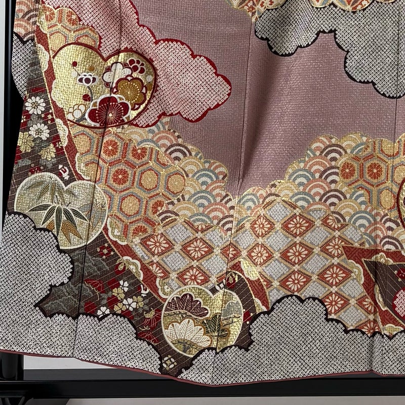 【着物ランク】秀品 【素材】正絹 【身丈】約156cm 【裄丈】約65cm 【袖丈】約112cm 【袖幅】約35cm 【前幅】約25cm 【後幅】約29.5cm 【サイズ】M 【着物仕立て】袷 【着用時期】10~5月 【状態ランク】ランクB 【着物着用シーン】成人式、謝恩会