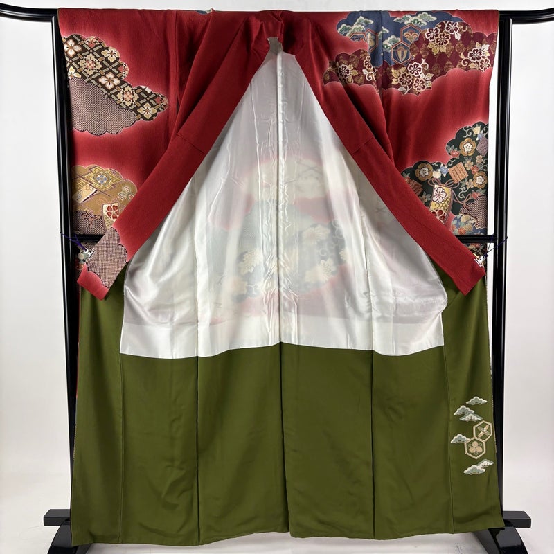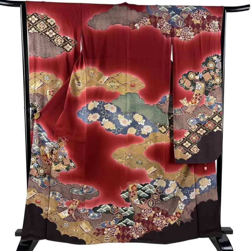 【振袖】 赤系 えんじ色 名品 A 約160cm~約169cm 裄丈63cm-64cm (M)size 袖丈91cm以上 9990-29990 美品 二万以下