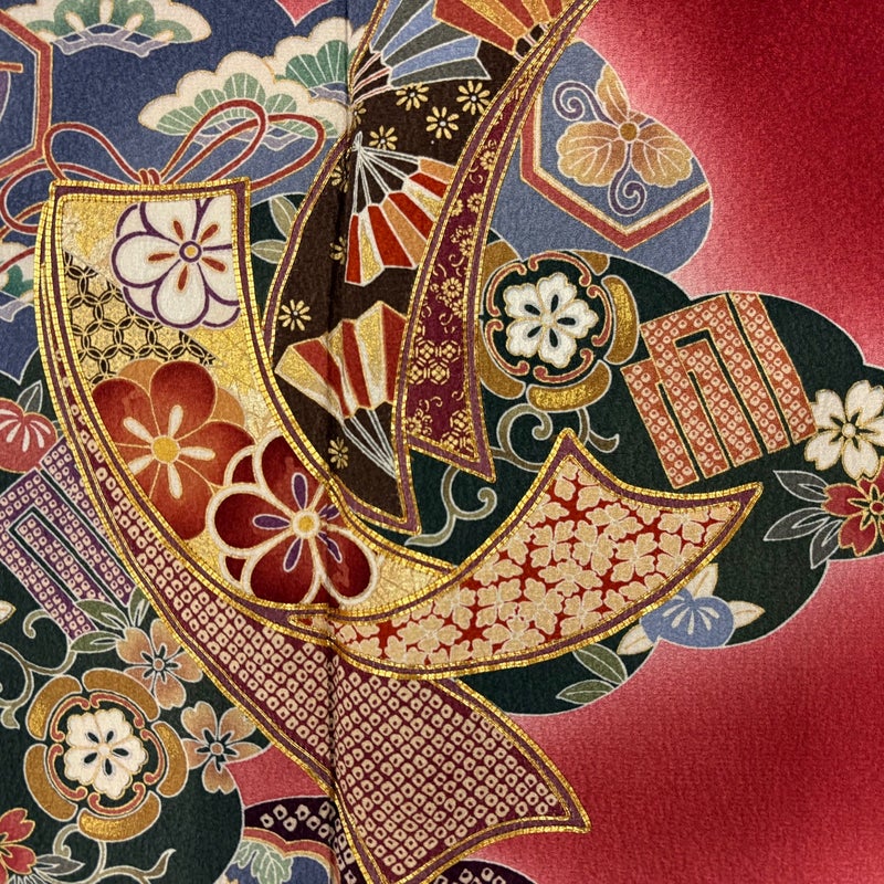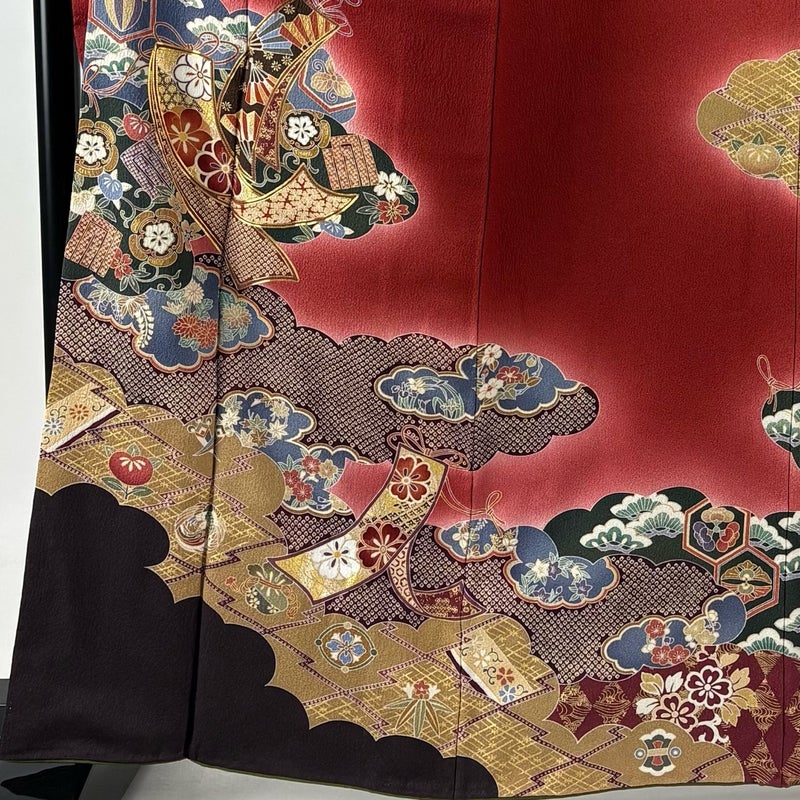 【着物ランク】名品 【素材】正絹 【身丈】約163cm 【裄丈】約64cm 【袖丈】約105cm 【袖幅】約34cm 【前幅】約25cm 【後幅】約29.5cm 【サイズ】M 【着物仕立て】袷 【着用時期】10~5月 【状態ランク】ランクA 【着物着用シーン】成人式、謝恩会