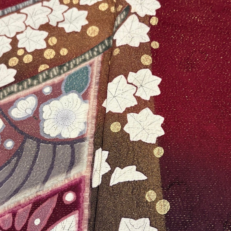 【着物ランク】名品 【素材】正絹 【身丈】約166cm 【裄丈】約69cm 【袖丈】約108cm 【袖幅】約36.5cm 【前幅】約24cm 【後幅】約29.5cm 【サイズ】L 【着物仕立て】袷 【着用時期】10~5月 【状態ランク】ランクB 【着物着用シーン】成人式、謝恩会