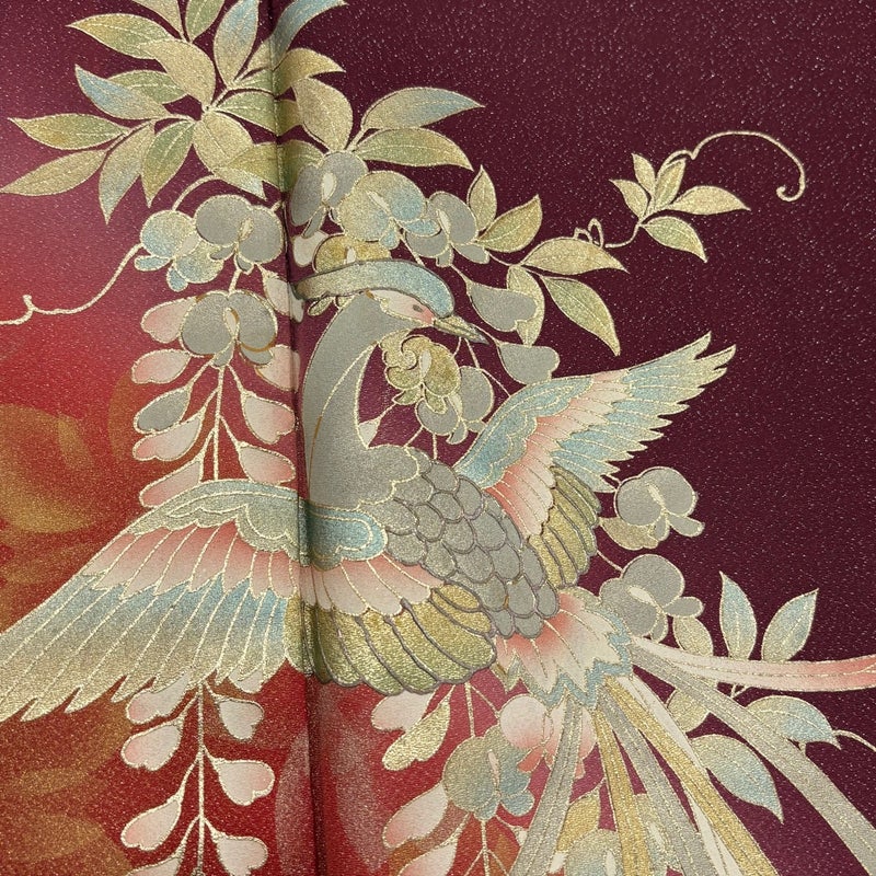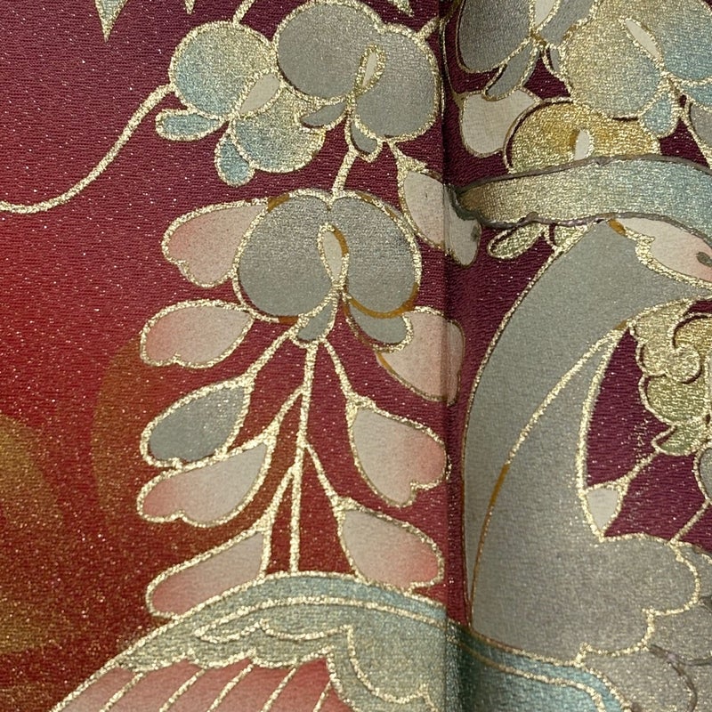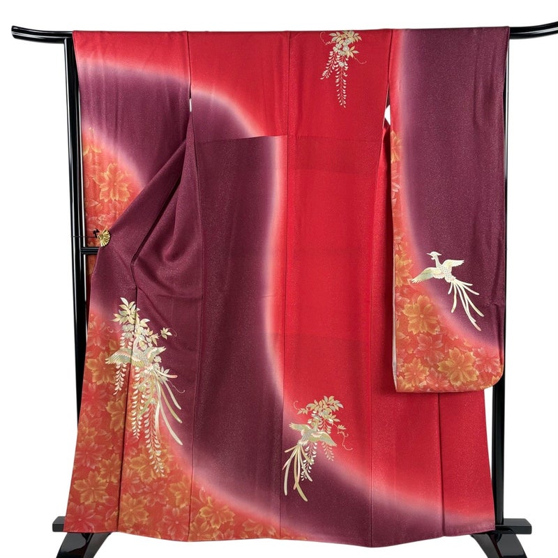 【着物ランク】名品 【素材】正絹 【身丈】約162cm 【裄丈】約65cm 【袖丈】約111cm 【袖幅】約35.5cm 【前幅】約23.5cm 【後幅】約29cm 【サイズ】M 【着物仕立て】袷 【着用時期】10~5月 【状態ランク】ランクB 【着物着用シーン】成人式、謝恩会