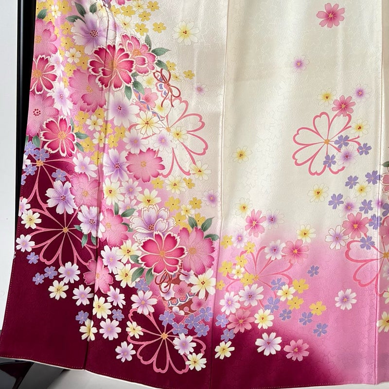 【着物ランク】名品 【素材】正絹 【身丈】約164cm 【裄丈】約66.5cm 【袖丈】約108cm 【袖幅】約34cm 【前幅】約24cm 【後幅】約30cm 【サイズ】M 【着物仕立て】袷 【着用時期】10~5月 【帯丈2】約446cm 【帯幅2】約31cm 【状態ランク】ランクA 【着物着用シーン】成人式、謝恩会