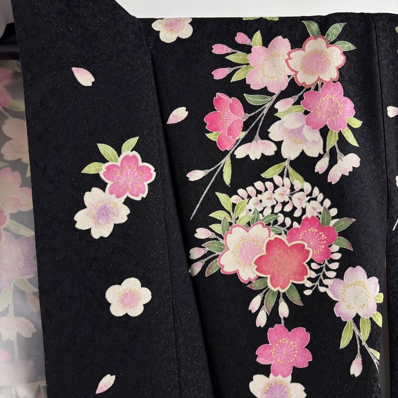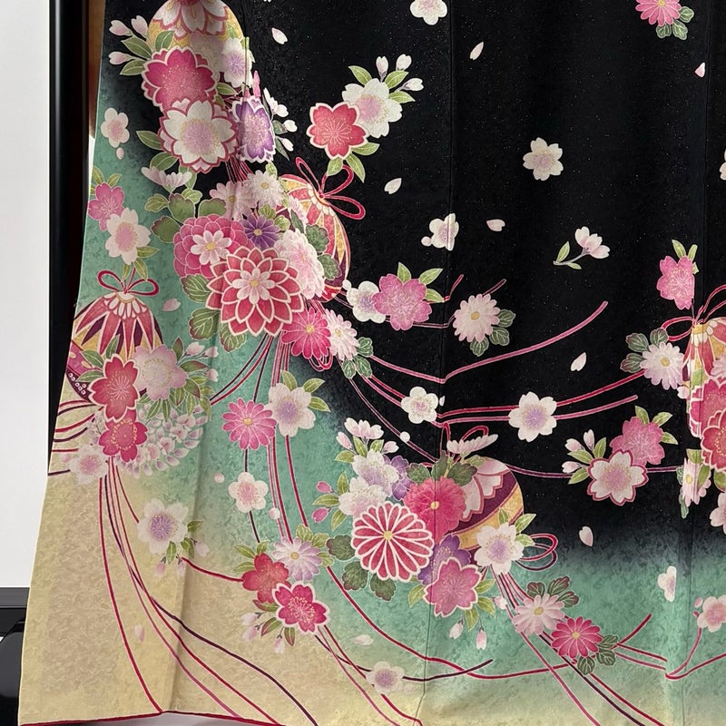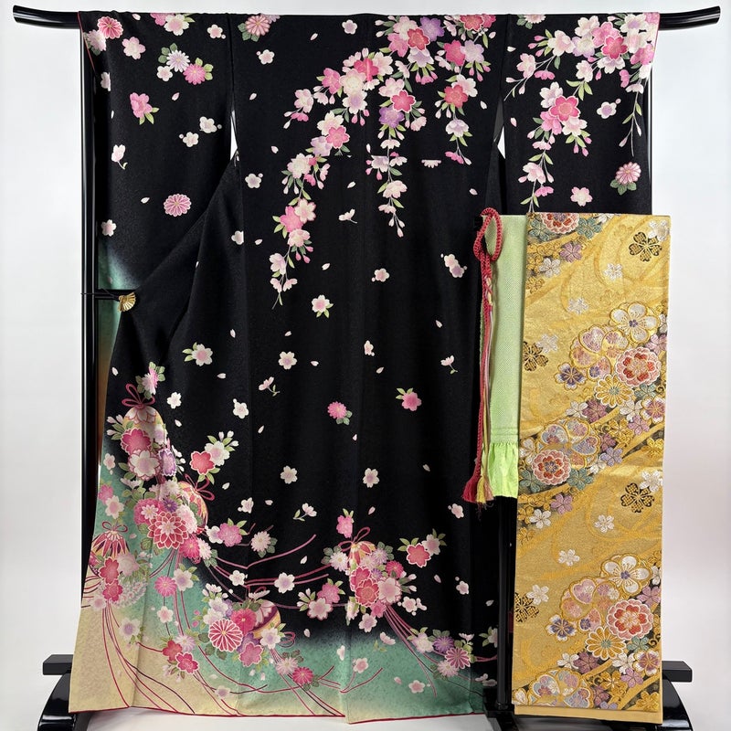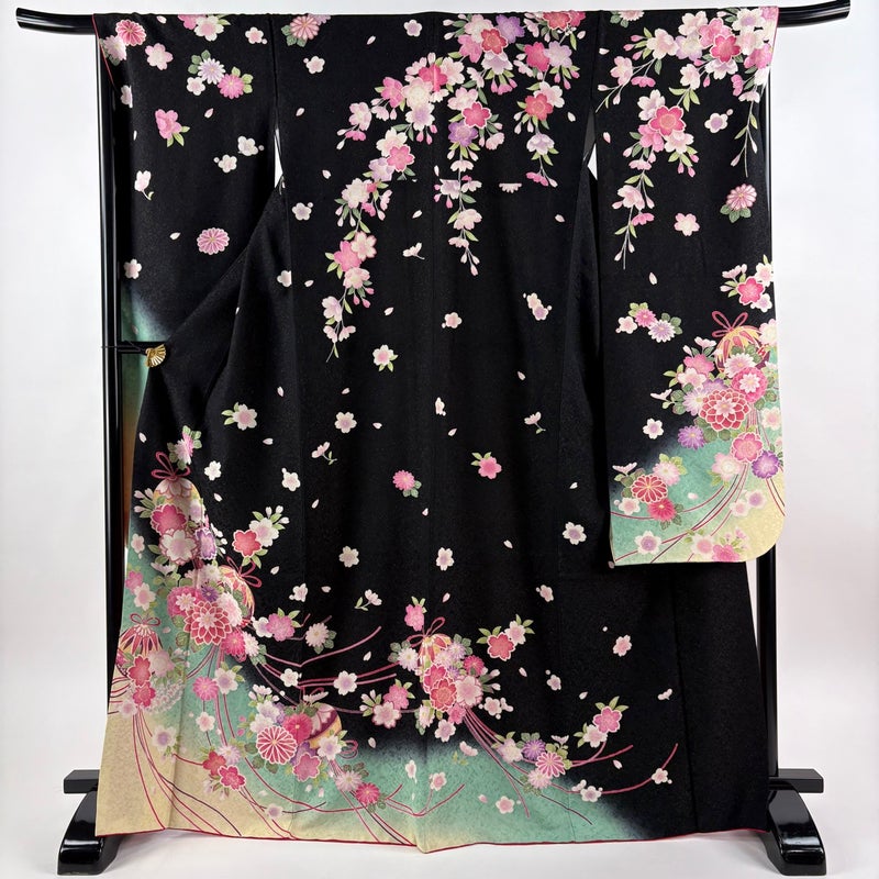 【振袖】 黒系 黒 名品 A 約160cm~約169cm 裄丈67cm-68cm (L)size 袖丈91cm以上 9990-29990 美品 五万以下
