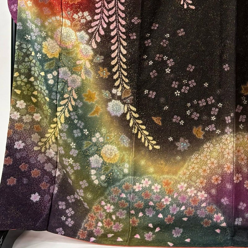 【着物ランク】名品 【素材】正絹 【身丈】約170cm 【裄丈】約68cm 【袖丈】約108cm 【袖幅】約34cm 【前幅】約24cm 【後幅】約30cm 【サイズ】L 【着物仕立て】袷 【着用時期】10~5月 【帯丈2】約440cm 【状態ランク】ランクA 【着物着用シーン】成人式、謝恩会