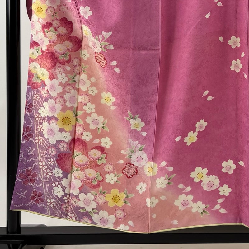 【着物ランク】秀品 【素材】正絹 【身丈】約156cm 【裄丈】約64cm 【袖丈】約102cm 【袖幅】約32cm 【前幅】約24cm 【後幅】約29.5cm 【サイズ】M 【着物仕立て】袷 【着用時期】10~5月 【状態ランク】ランクB 【着物着用シーン】成人式、謝恩会