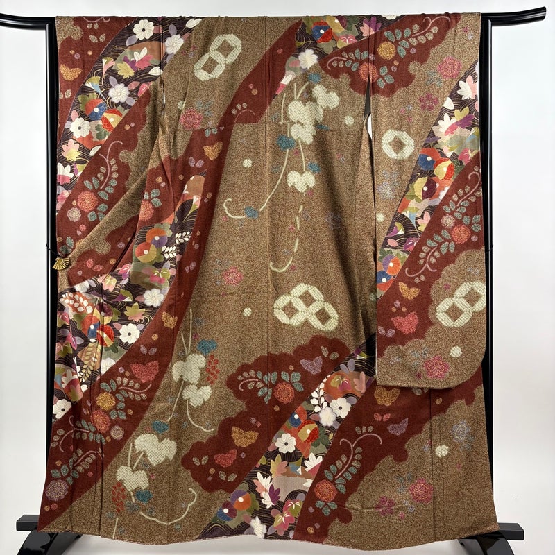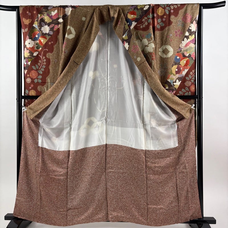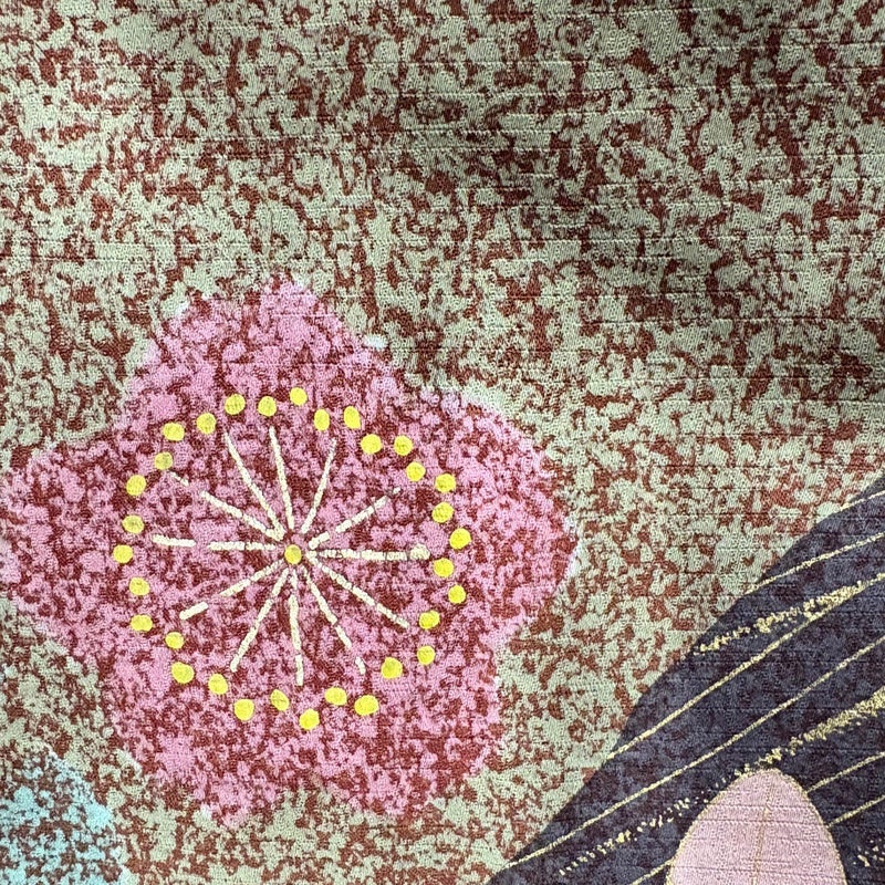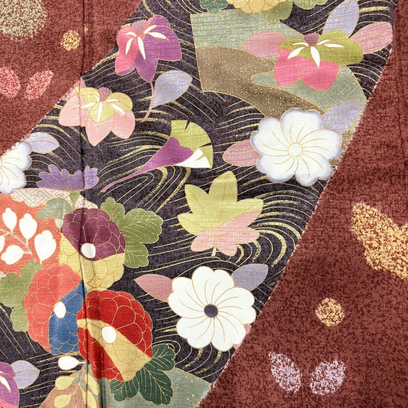 【着物ランク】名品 【素材】正絹 【身丈】約161.5cm 【裄丈】約65cm 【袖丈】約112cm 【袖幅】約32.5cm 【前幅】約25cm 【後幅】約31cm 【サイズ】M 【着物仕立て】袷 【着用時期】10~5月 【状態ランク】ランクB 【着物着用シーン】成人式、謝恩会