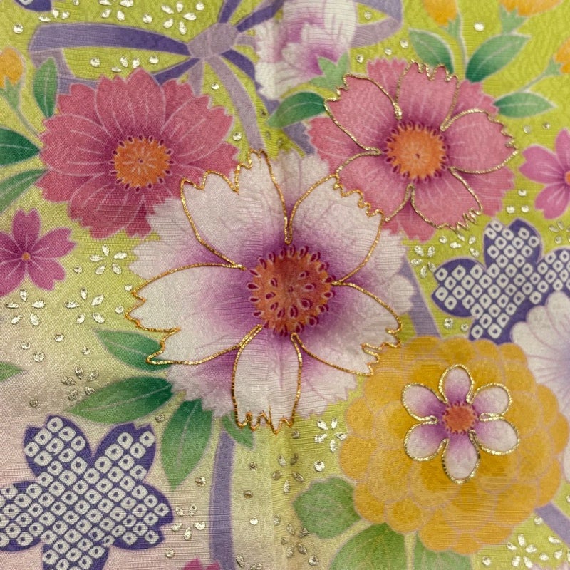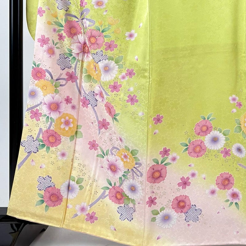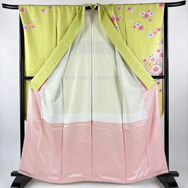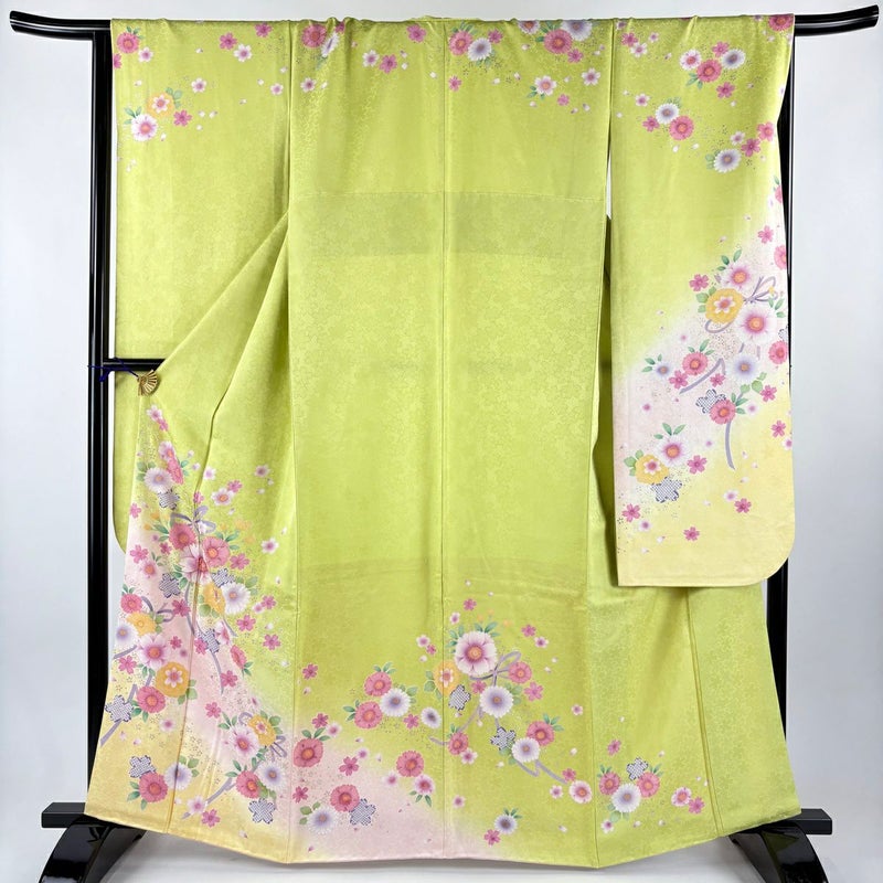 【振袖】 緑系 黄緑色 秀品 B 約160cm~約169cm 裄丈67cm-68cm (L)size 袖丈91cm以上 7990-9980 二万以下