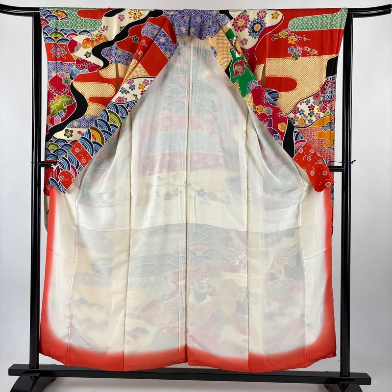 【振袖】 赤系 朱色 秀品 B 約150cm~約159cm 裄丈63cm-64cm (M)size 袖丈91cm以上 7990-9980 二万以下