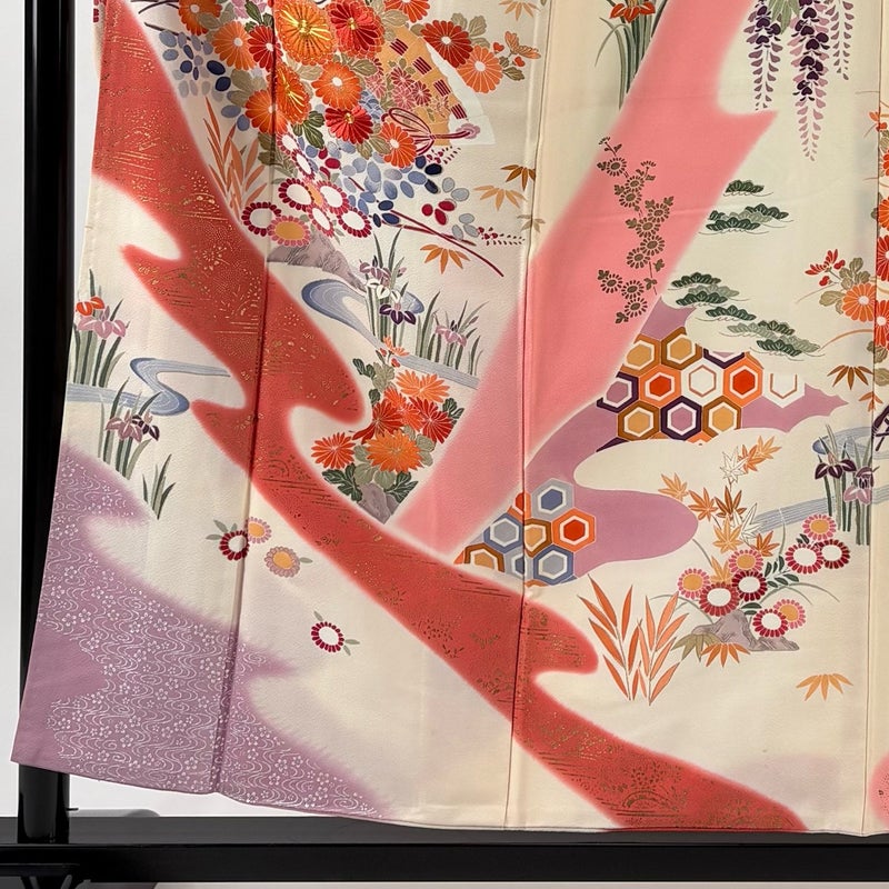 【着物ランク】秀品 【素材】正絹 【身丈】約156.5cm 【裄丈】約62.5cm 【袖丈】約104cm 【袖幅】約32cm 【前幅】約24.5cm 【後幅】約29.5cm 【サイズ】S 【着物仕立て】袷 【着用時期】10~5月 【状態ランク】ランクC 【着物着用シーン】成人式、謝恩会