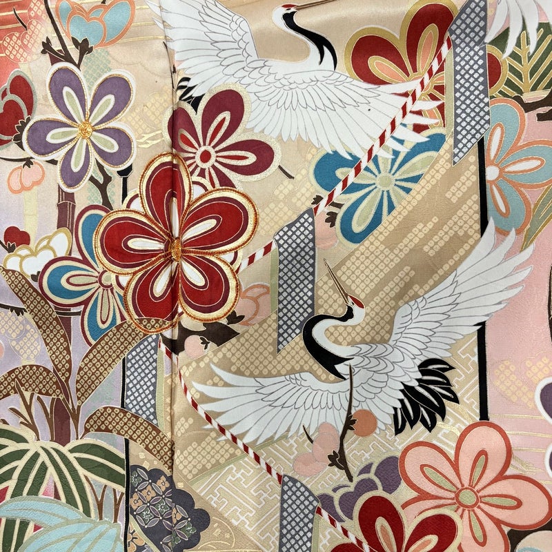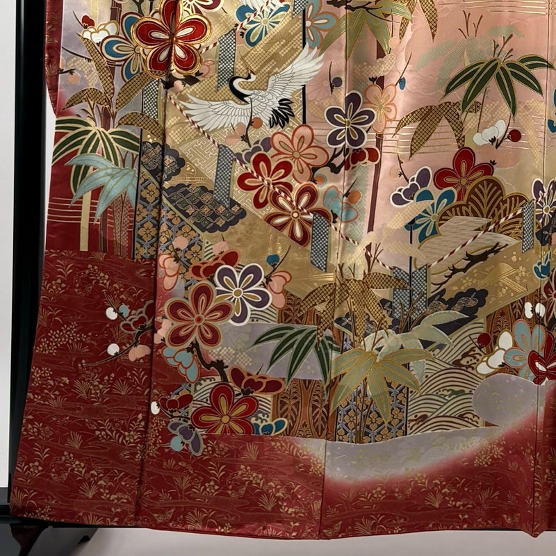 【着物ランク】秀品 【素材】正絹 【身丈】約162cm 【裄丈】約66.5cm 【袖丈】約111cm 【袖幅】約35cm 【前幅】約22cm 【後幅】約29cm 【サイズ】M 【着物仕立て】袷 【着用時期】10~5月 【状態ランク】ランクB 【着物着用シーン】成人式、謝恩会