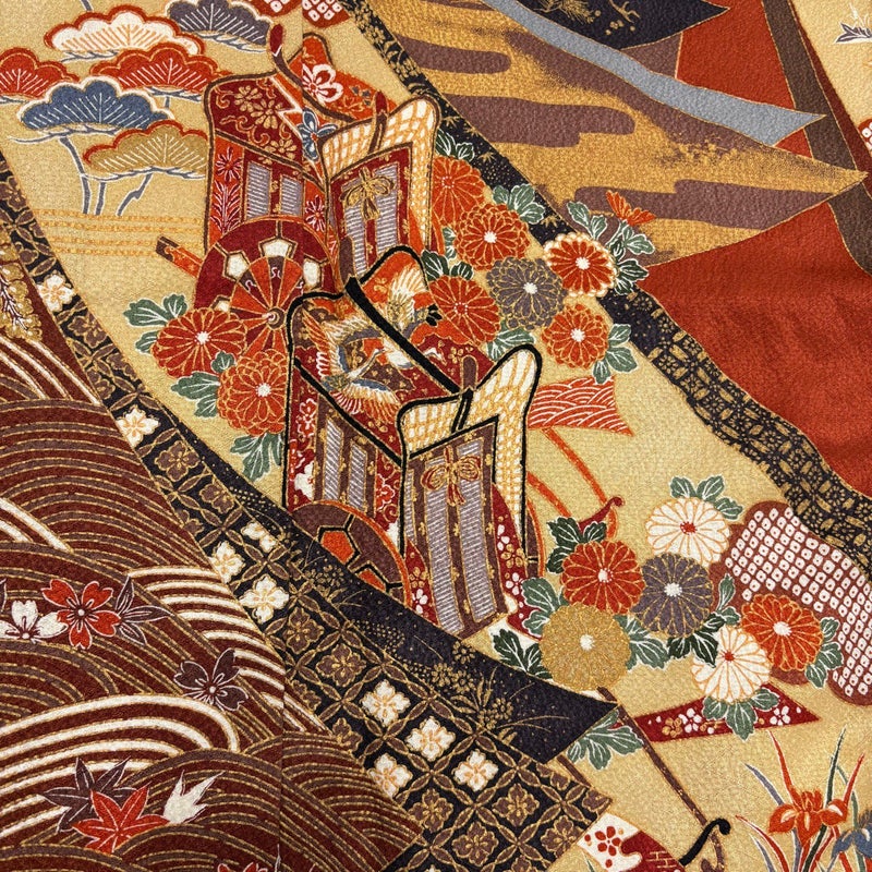 【着物ランク】秀品 【素材】正絹 【身丈】約171cm 【裄丈】約65.5cm 【袖丈】約111.5cm 【袖幅】約34cm 【前幅】約24.5cm 【後幅】約30cm 【サイズ】M 【着物仕立て】袷 【着用時期】10~5月 【状態ランク】ランクB 【着物着用シーン】成人式、謝恩会