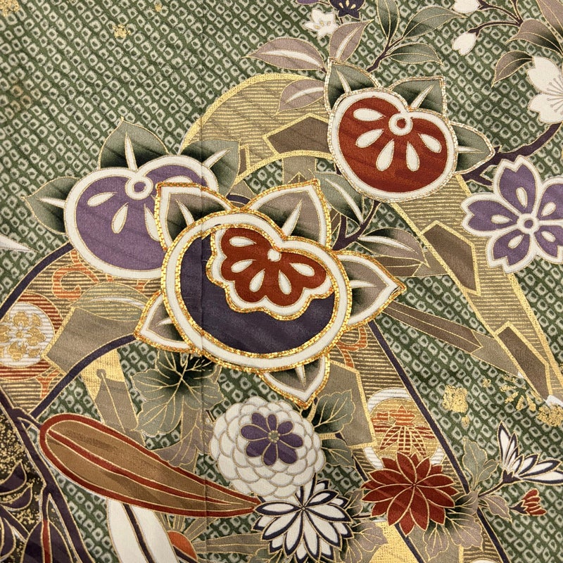 【振袖】 灰色系 灰緑 秀品 B 約160cm~約169cm 裄丈67cm-68cm (M)size 袖丈91cm以上 7990-9980 二万以下