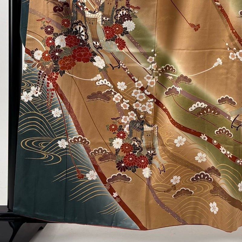 未婚女性の第一礼装としてお使いいただける振袖でございます。 お好みの帯や小物と合わせて晴れの日に相応しい華やかな装いにいかがでしょうか。 ※身丈・裄丈の縫込みの長さは測っておりません。 表地所々にヤケ、下前と左後袖にシミ、衿周りや両袖口中に薄汚れ、表地所々にシワ、表地所々に金彩の剥がれ、表地所々に金彩の変色がございます。 裏地所々にシミがございます。 ご購入の際はその点ご留意ください。 ※なお、厳しく商品の状態確認を行っておりますが、記載の汚れ以外にも見落とし箇所がある可能性がある旨ご了承いただけますと幸いです。 沢山の商品の中からご覧いただき誠にありがとうございます。