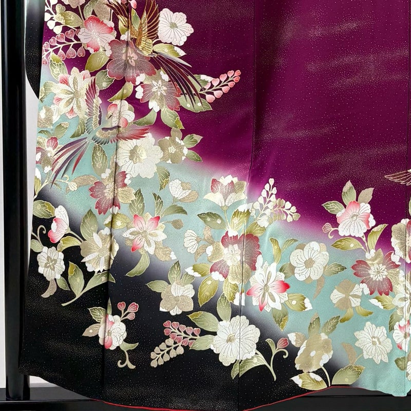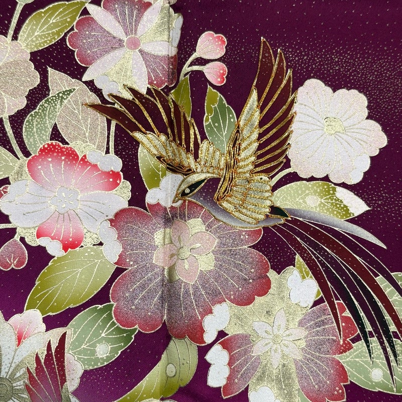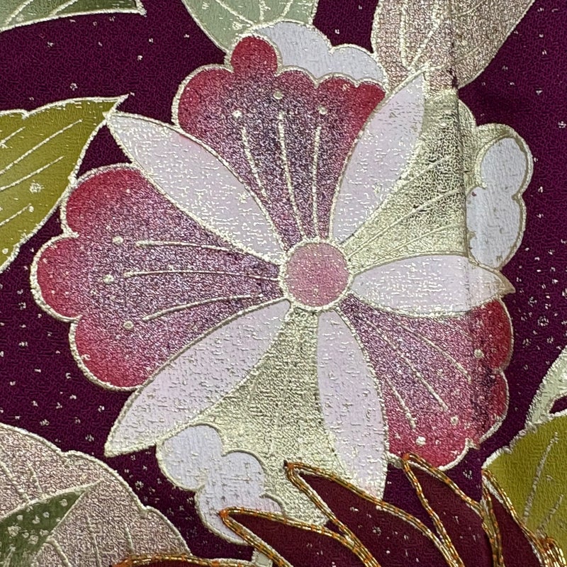 【着物ランク】秀品 【素材】正絹 【身丈】約156cm 【裄丈】約64cm 【袖丈】約106.5cm 【袖幅】約34cm 【前幅】約23cm 【後幅】約30cm 【サイズ】M 【着物仕立て】袷 【着用時期】10~5月 【状態ランク】ランクB 【着物着用シーン】成人式、謝恩会