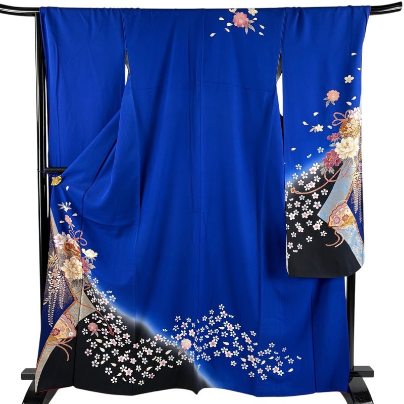【着物ランク】秀品 【素材】正絹 【身丈】約164cm 【裄丈】約70cm 【袖丈】約112.5cm 【袖幅】約35.5cm 【前幅】約26.5cm 【後幅】約30.5cm 【サイズ】L 【着物仕立て】袷 【着用時期】10~5月 【状態ランク】ランクB 【着物着用シーン】成人式、謝恩会