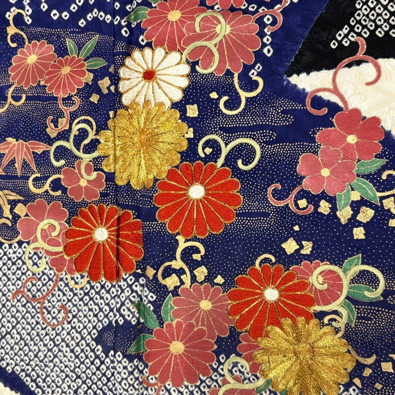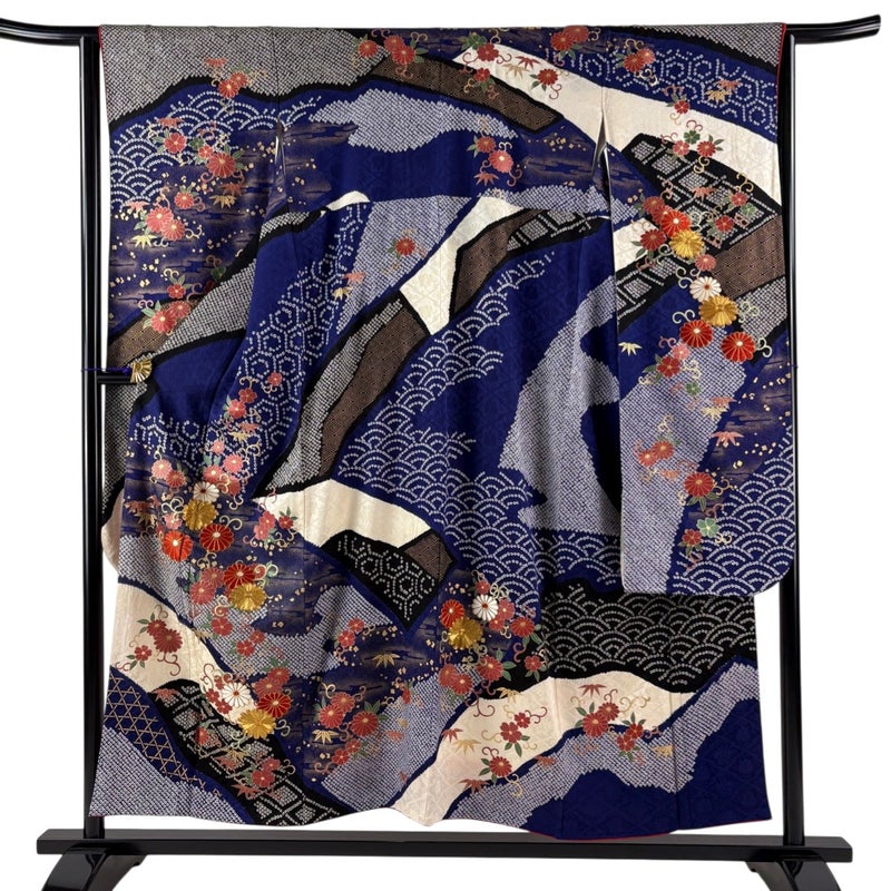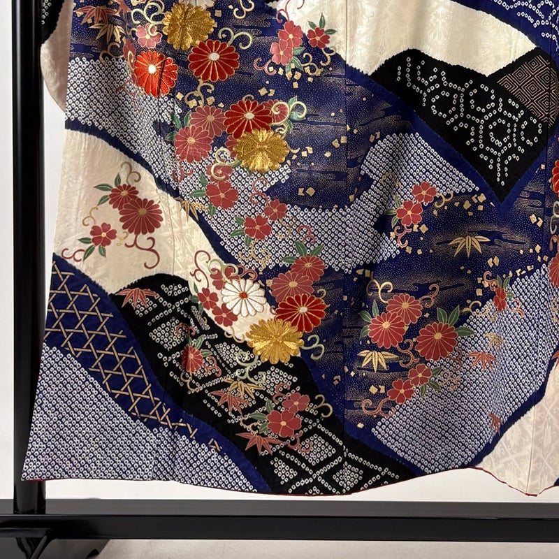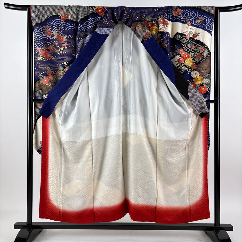 【振袖】 青系 紺色 秀品 B 約150cm~約159cm 裄丈63cm-64cm (M)size 袖丈91cm以上 7990-9980 二万以下