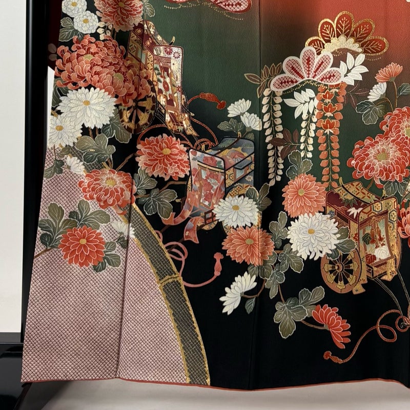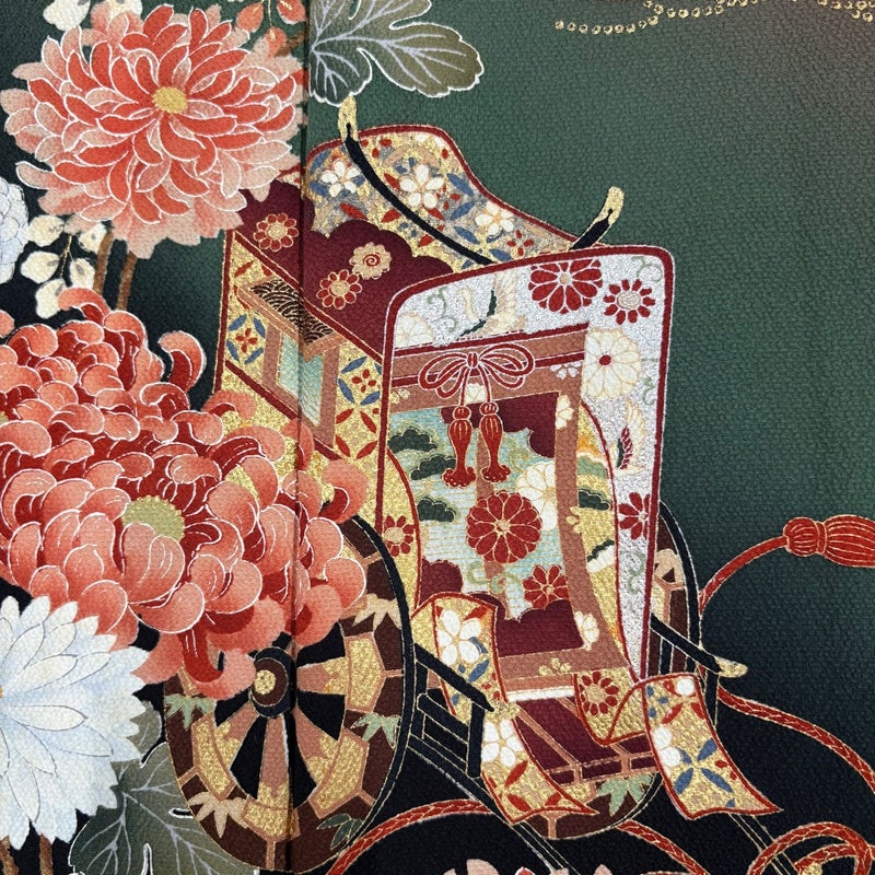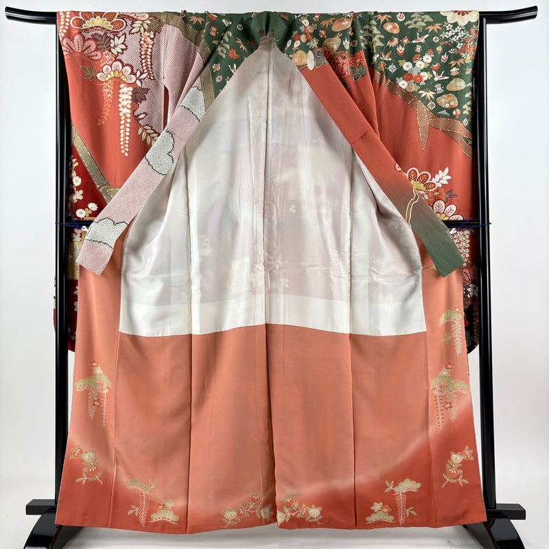 【着物ランク】秀品 【素材】正絹 【身丈】約161cm 【裄丈】約66cm 【袖丈】約109cm 【袖幅】約34cm 【前幅】約24cm 【後幅】約30.5cm 【サイズ】M 【着物仕立て】袷 【着用時期】10~5月 【状態ランク】ランクC 【着物着用シーン】成人式、謝恩会