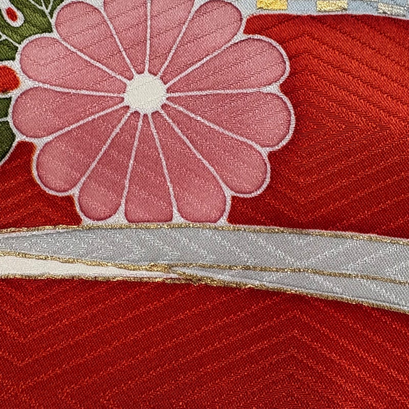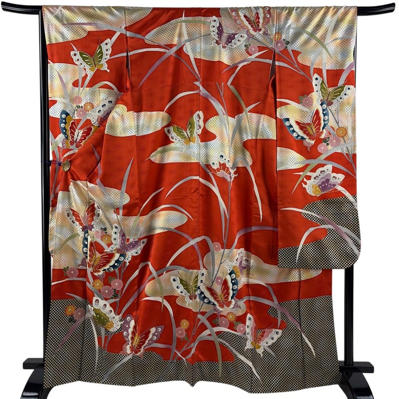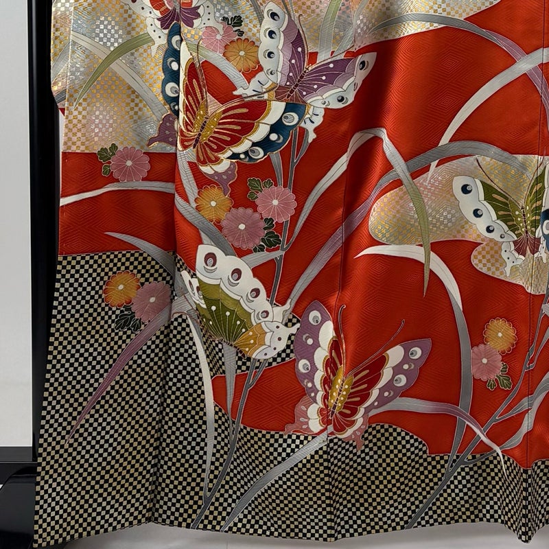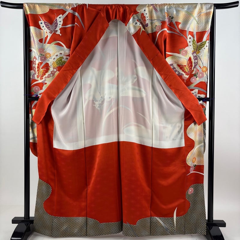 【振袖】 赤系 朱色 秀品 B 約160cm~約169cm 裄丈66cm (M)size 袖丈91cm以上 7990-9980 二万以下