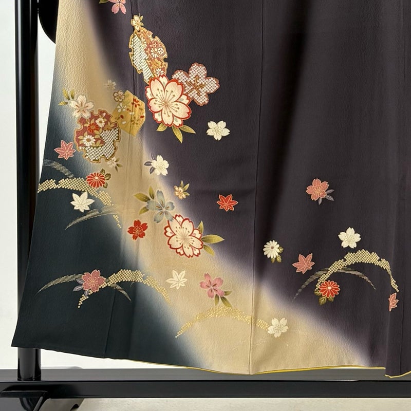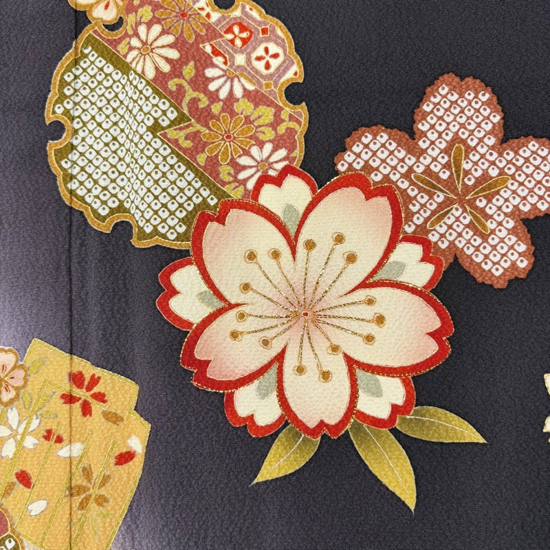 【着物ランク】秀品 【素材】正絹 【身丈】約155cm 【裄丈】約66cm 【袖丈】約100cm 【袖幅】約34cm 【前幅】約25cm 【後幅】約30.5cm 【サイズ】M 【着物仕立て】袷 【着用時期】10~5月 【状態ランク】ランクA 【着物着用シーン】成人式、謝恩会