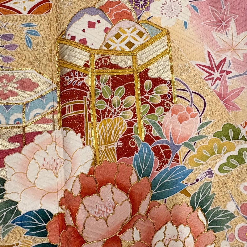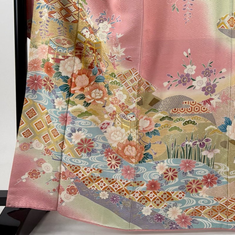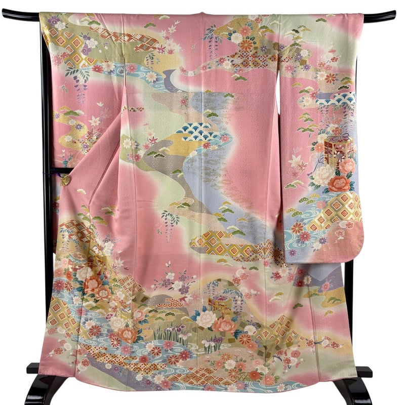 【着物ランク】秀品 【素材】正絹 【身丈】約164cm 【裄丈】約67.5cm 【袖丈】約106.5cm 【袖幅】約34.5cm 【前幅】約25cm 【後幅】約30.5cm 【サイズ】L 【着物仕立て】袷 【着用時期】10~5月 【状態ランク】ランクC 【着物着用シーン】成人式、謝恩会