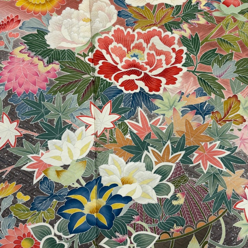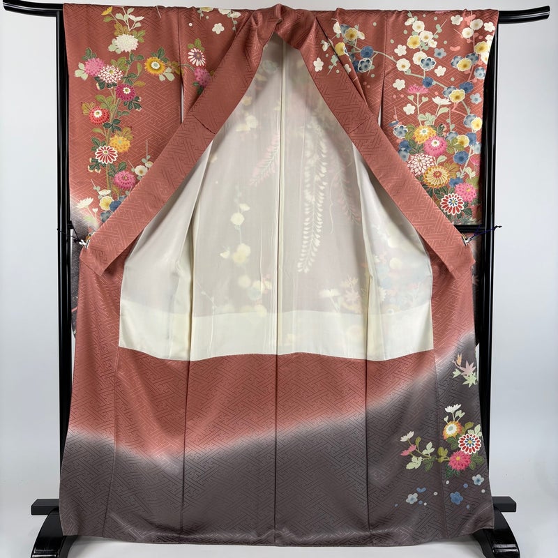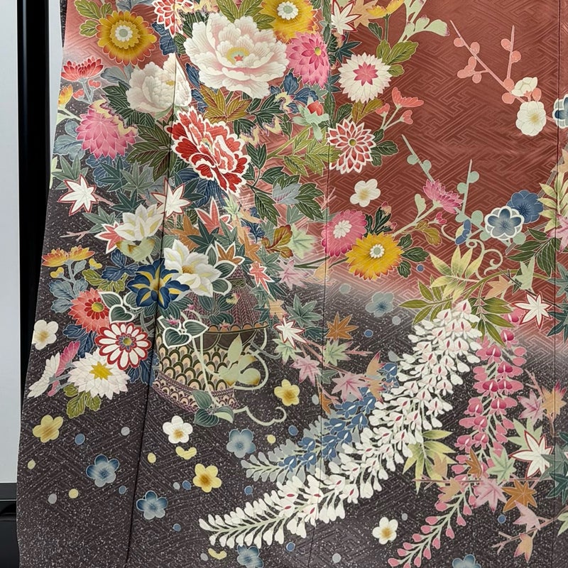 【着物ランク】秀品 【素材】正絹 【身丈】約168cm 【裄丈】約66cm 【袖丈】約109cm 【袖幅】約34cm 【前幅】約24cm 【後幅】約30cm 【サイズ】M 【着物仕立て】袷 【着用時期】10~5月 【状態ランク】ランクB 【着物着用シーン】成人式、謝恩会