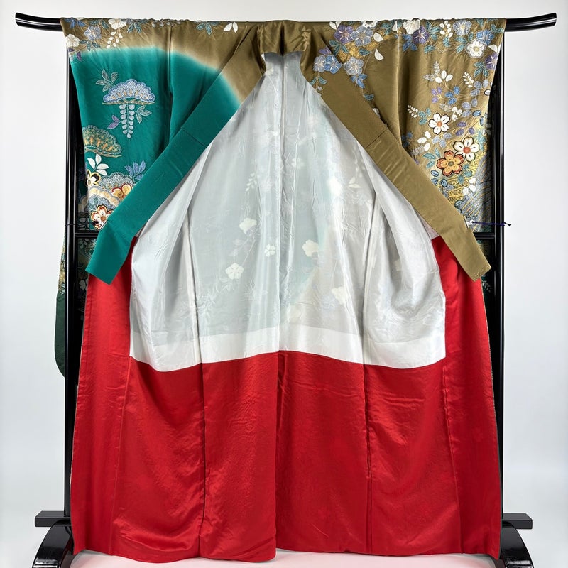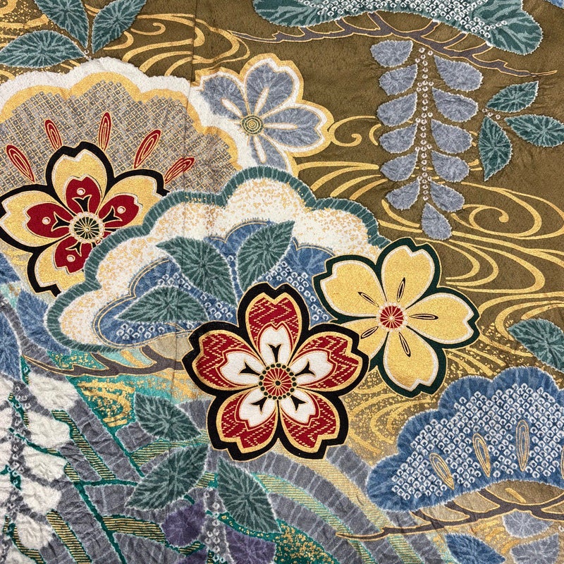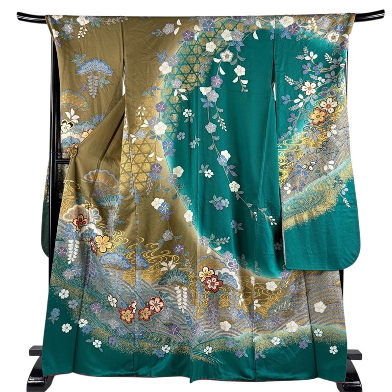 【着物ランク】秀品 【素材】正絹 【身丈】約167cm 【裄丈】約70cm 【袖丈】約115cm 【袖幅】約35.5cm 【前幅】約28cm 【後幅】約34cm 【サイズ】L 【着物仕立て】袷 【着用時期】10~5月 【状態ランク】ランクB 【着物着用シーン】成人式、謝恩会