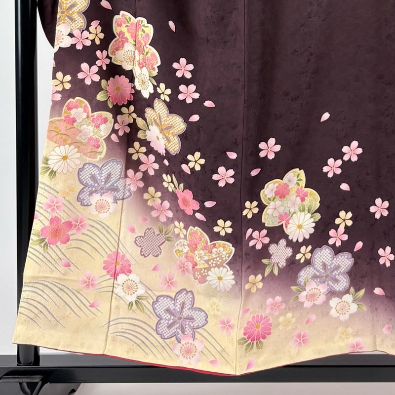 【着物ランク】秀品 【素材】正絹 【身丈】約154.5cm 【裄丈】約64cm 【袖丈】約103.5cm 【袖幅】約33cm 【前幅】約24cm 【後幅】約30cm 【サイズ】M 【着物仕立て】袷 【着用時期】10~5月 【状態ランク】ランクB 【着物着用シーン】成人式、謝恩会