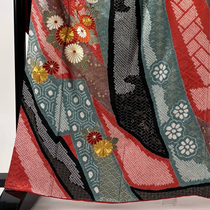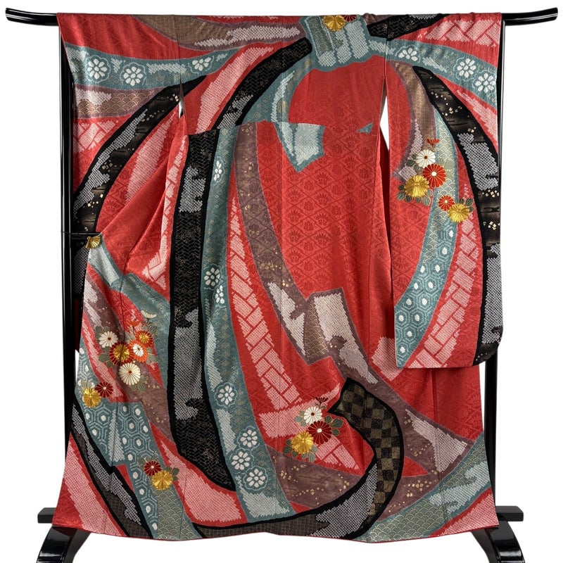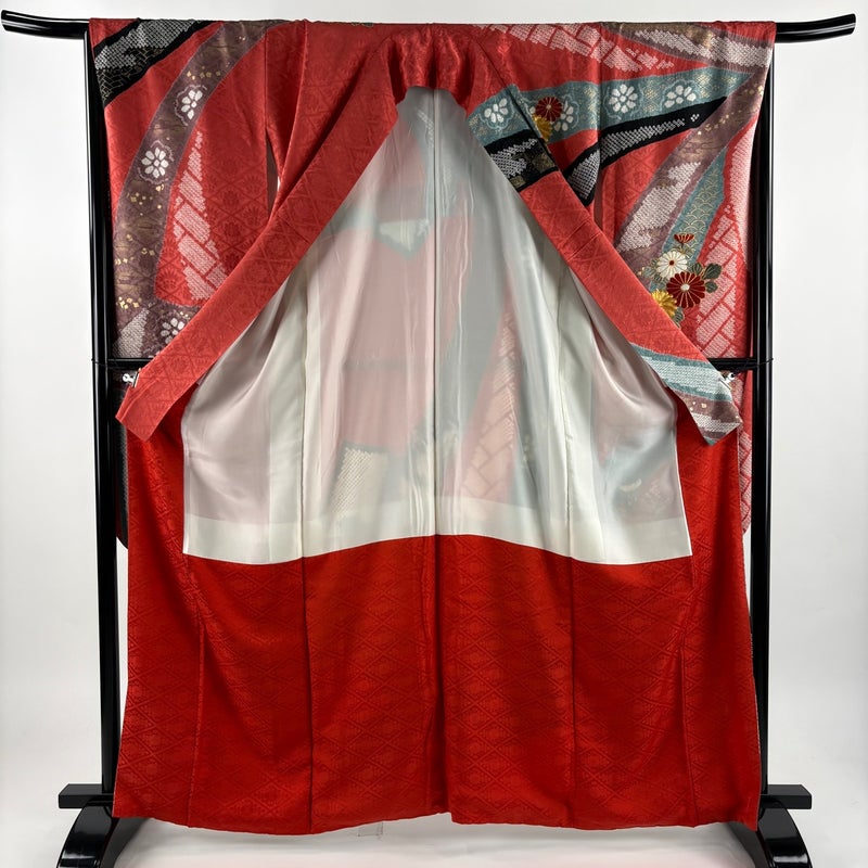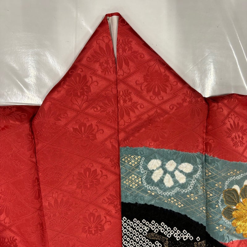 【振袖】 赤系 朱色 秀品 B 約160cm~約169cm 裄丈67cm-68cm (M)size 袖丈91cm以上 7990-9980 二万以下