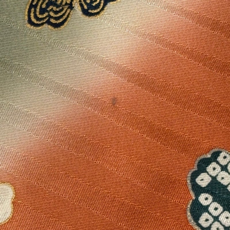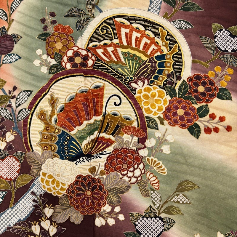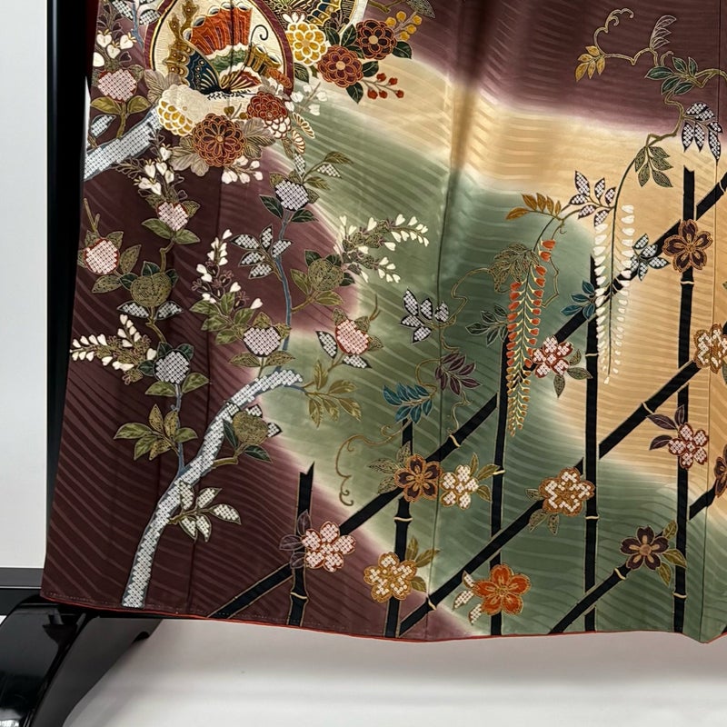 【着物ランク】秀品 【素材】正絹 【身丈】約161cm 【裄丈】約66cm 【袖丈】約112cm 【袖幅】約34.5cm 【前幅】約25cm 【後幅】約29.5cm 【サイズ】M 【着物仕立て】袷 【着用時期】10~5月 【状態ランク】ランクB 【着物着用シーン】成人式、謝恩会