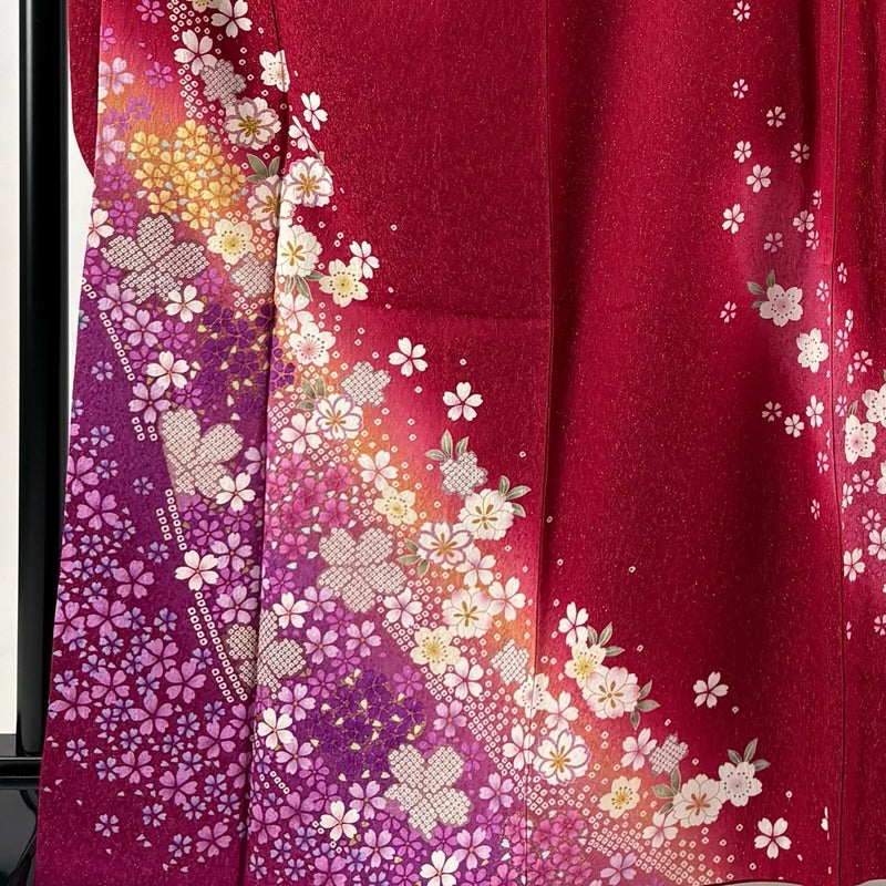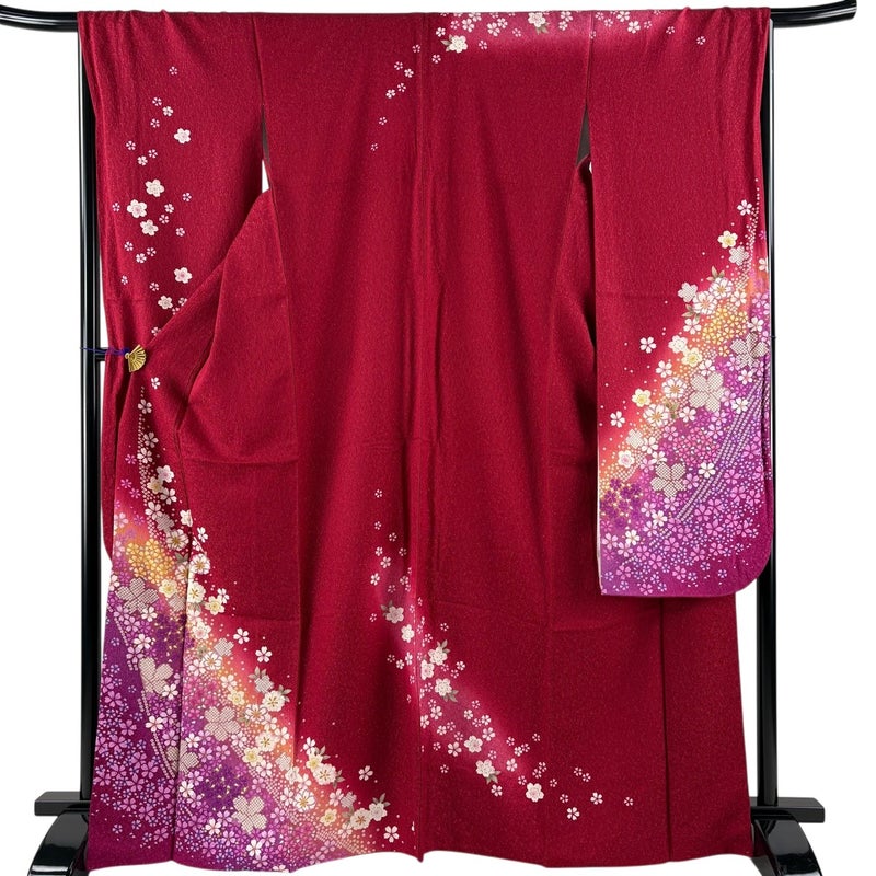【着物ランク】秀品 【素材】正絹 【身丈】約168cm 【裄丈】約67cm 【袖丈】約115cm 【袖幅】約34.5cm 【前幅】約24.5cm 【後幅】約30cm 【サイズ】M 【着物仕立て】袷 【着用時期】10~5月 【状態ランク】ランクB 【着物着用シーン】成人式、謝恩会
