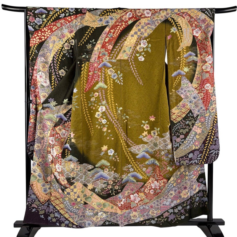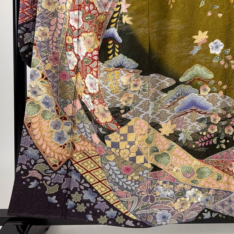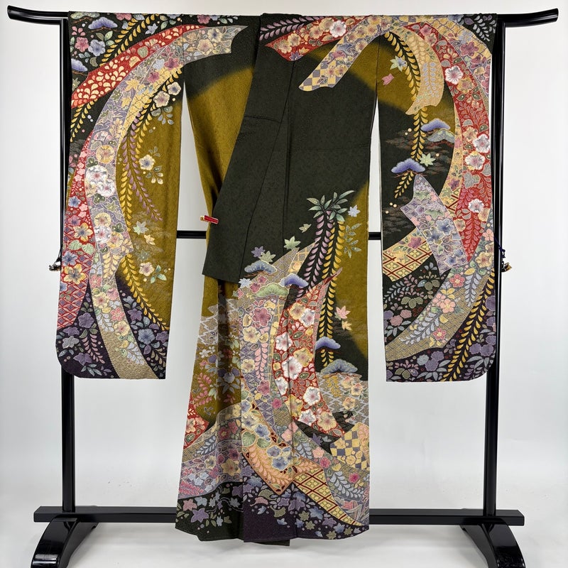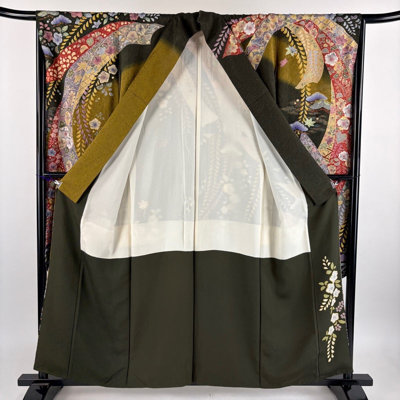 【振袖】 茶系 茶緑色 逸品 B 約150cm~約159cm 裄丈65cm (M)size 袖丈91cm以上 30000- 五万以下