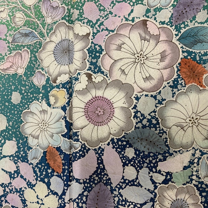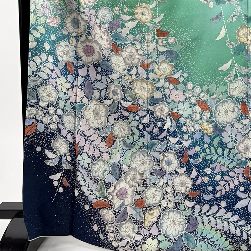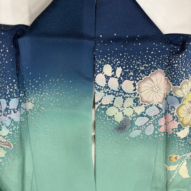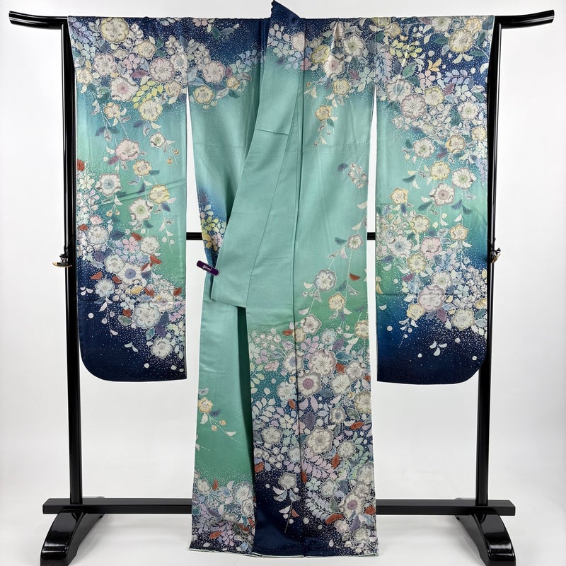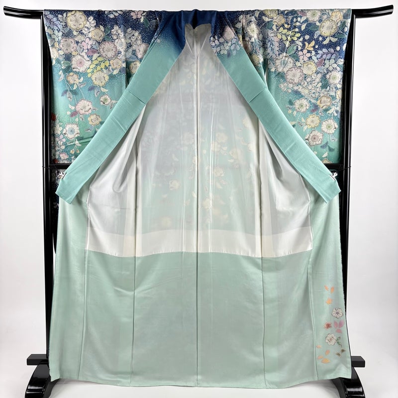 【振袖】 青系 青緑 逸品 A 約160cm~約169cm 裄丈67cm-68cm (L)size 袖丈91cm以上 30000- 美品 五万以下