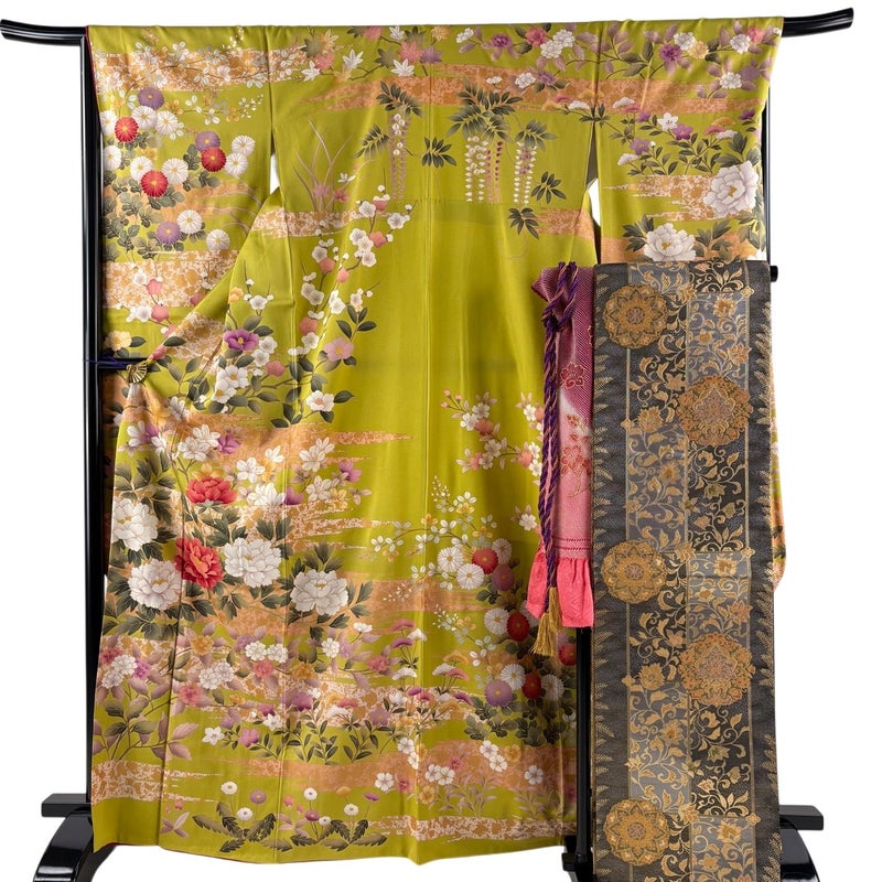 帯揚げ・帯締めはサービス品です。 未婚女性の第一礼装としてお使いいただける振袖でございます。 お好みの帯や小物と合わせて晴れの日に相応しい華やかな装いにいかがでしょうか。 ※身丈・裄丈の縫込みの長さは測っておりません。 表地所々に金彩の変色がございます。 リユース品としては良い状態で、まだまだご活用頂けると思われます。 ※帯は丁寧に細部まで状態確認しておりません。予めご了承くださいませ。 ※なお、厳しく商品の状態確認を行っておりますが、記載の汚れ以外にも見落とし箇所がある可能性がある旨ご了承いただけますと幸いです。 沢山の商品の中からご覧いただき誠にありがとうございます。