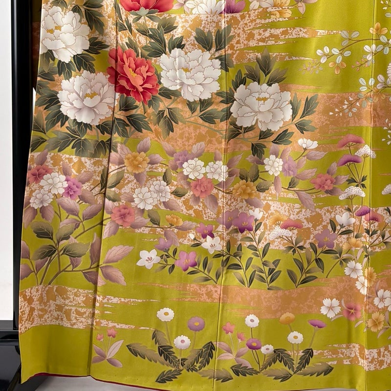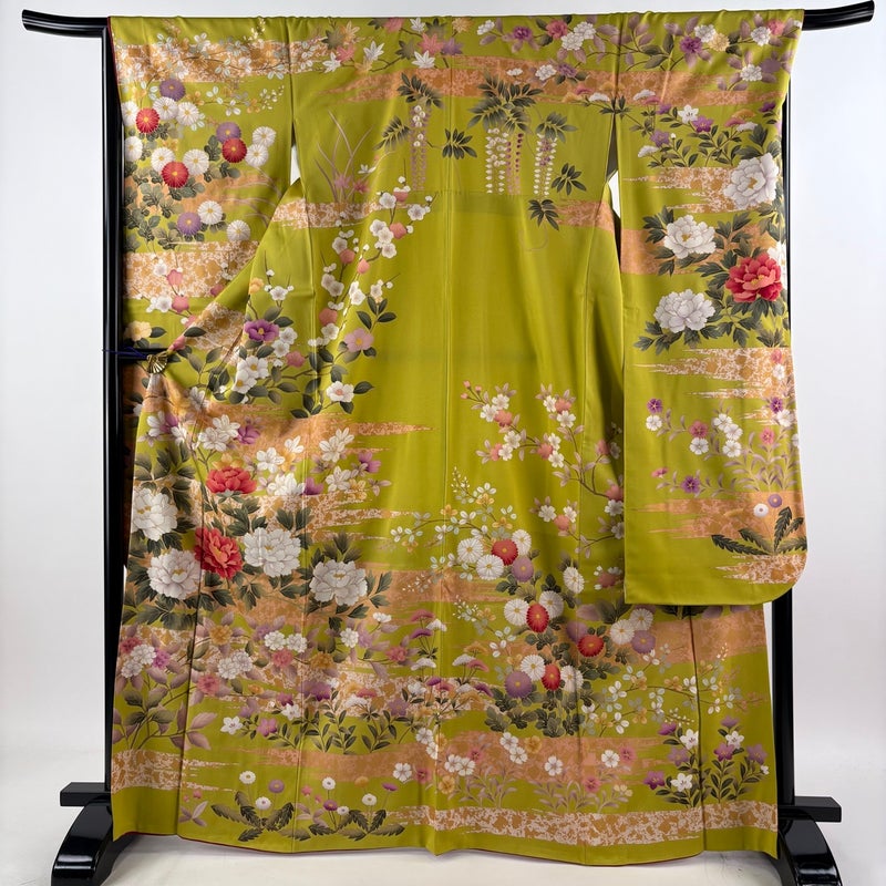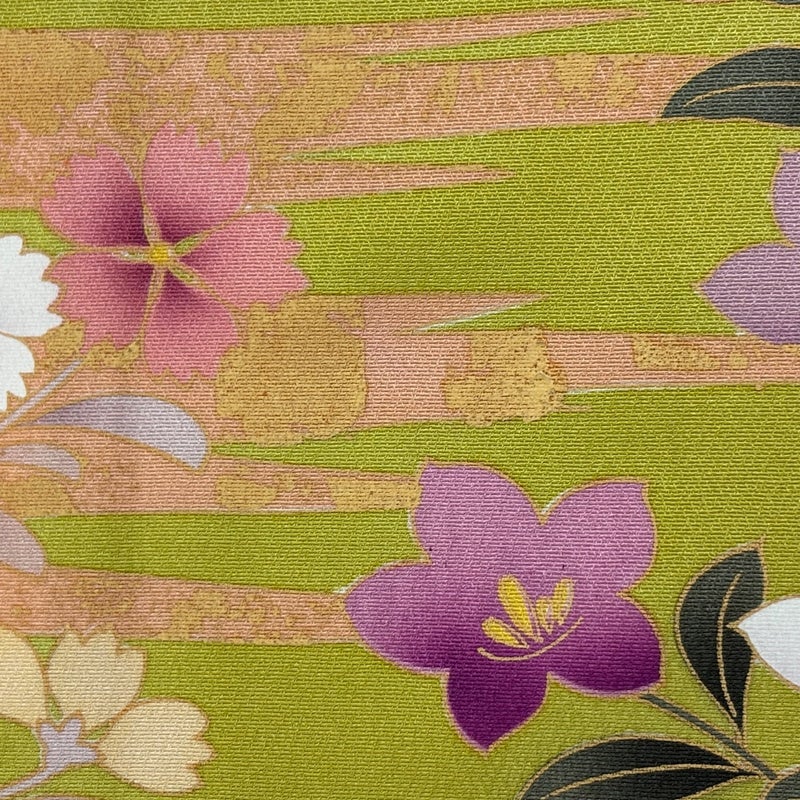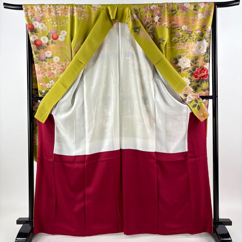 【振袖】 緑系 抹茶色 名品 B 約160cm~約169cm 裄丈67cm-68cm (L)size 袖丈91cm以上 9990-29990 五万以下