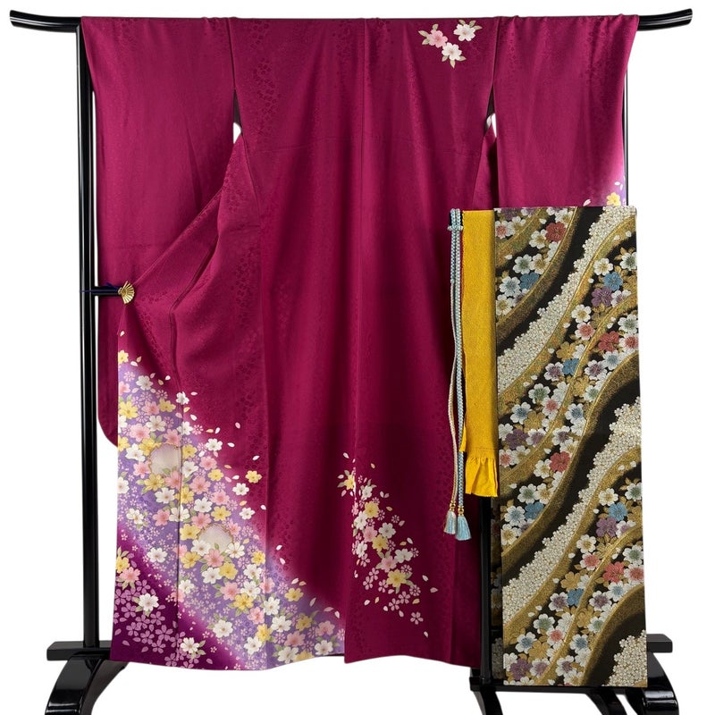 【着物ランク】秀品 【素材】正絹 【身丈】約161cm 【裄丈】約68.5cm 【袖丈】約108cm 【袖幅】約34.5cm 【前幅】約23.5cm 【後幅】約30cm 【サイズ】L 【着物仕立て】袷 【着用時期】10~5月 【帯丈2】約432cm 【帯幅2】約31cm 【状態ランク】ランクA 【着物着用シーン】成人式、謝恩会
