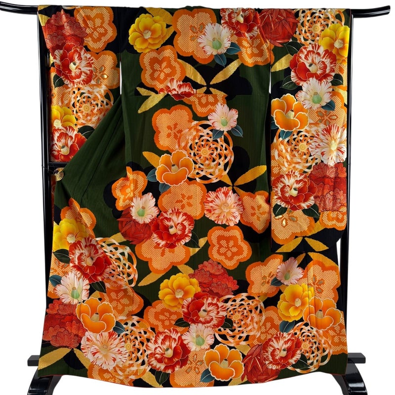 【振袖】 茶系 茶緑色 優品 A 約170cm~約179cm 裄丈67cm-68cm (L)size 袖丈91cm以上 4000-7980 美品 二万以下
