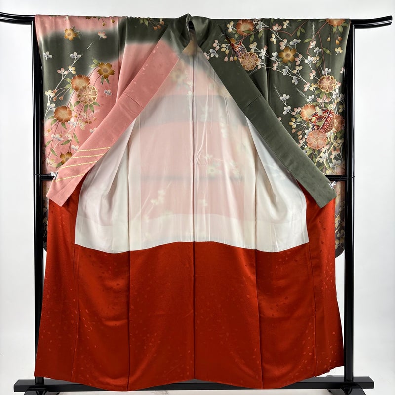【振袖】 茶系 茶緑色 優品 A 約150cm~約159cm 裄丈66cm (M)size 袖丈91cm以上 4000-7980 美品 二万以下