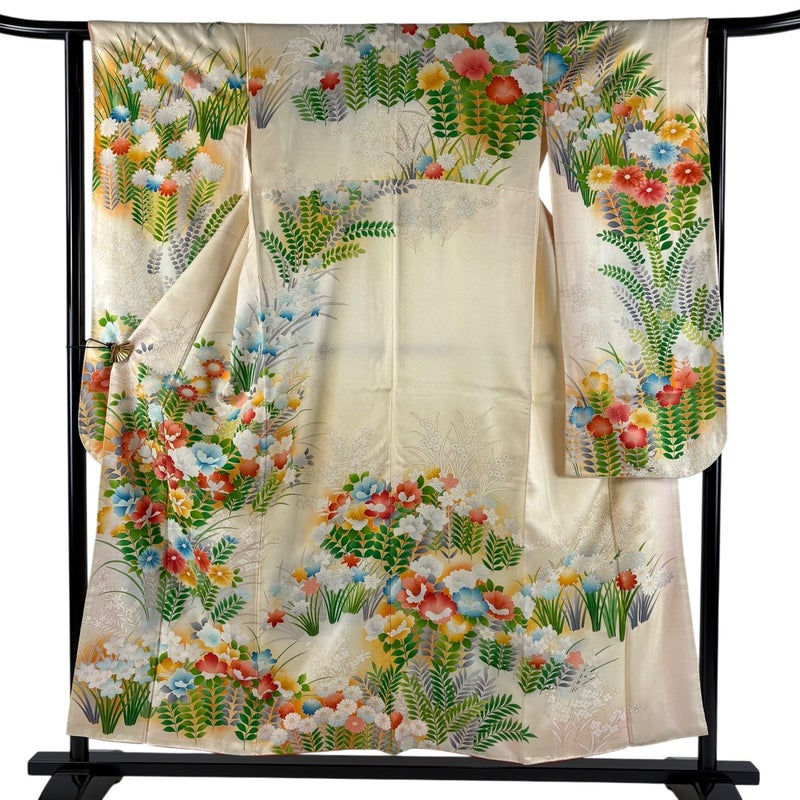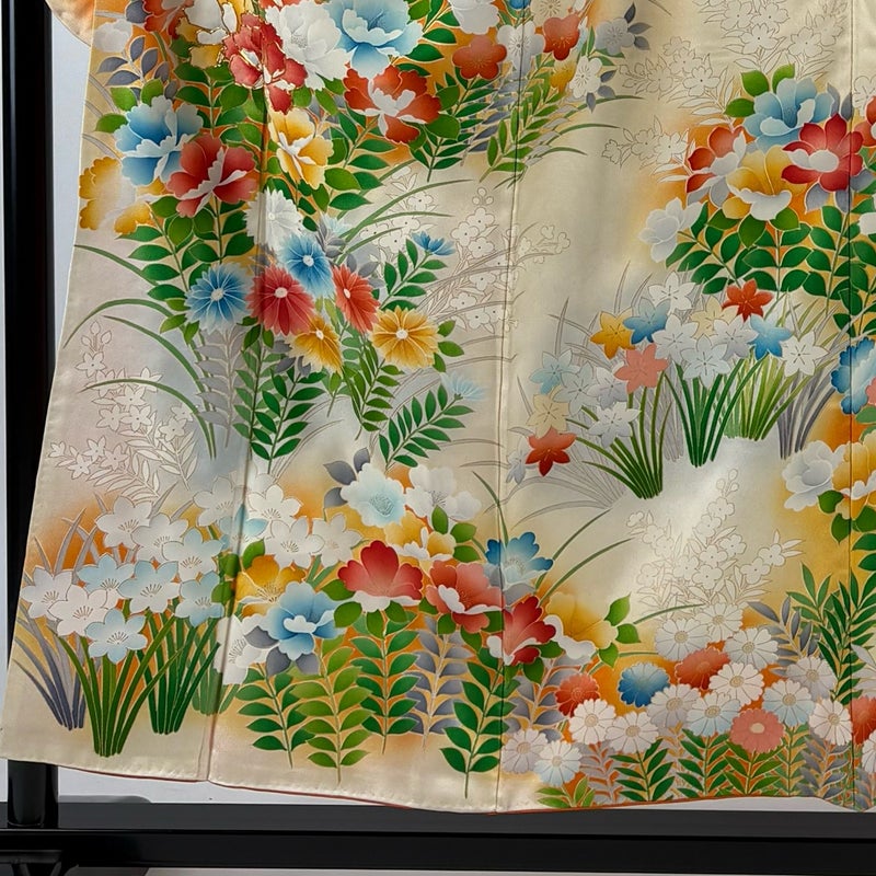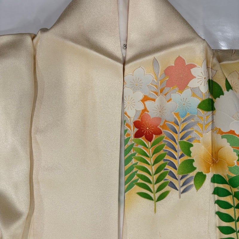 【着物ランク】優品 【素材】正絹 【身丈】約154cm 【裄丈】約62cm 【袖丈】約94cm 【袖幅】約32cm 【前幅】約24cm 【後幅】約29.5cm 【サイズ】S 【着物仕立て】袷 【着用時期】10~5月 【状態ランク】ランクB 【着物着用シーン】成人式、謝恩会