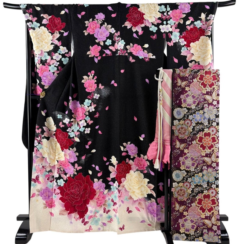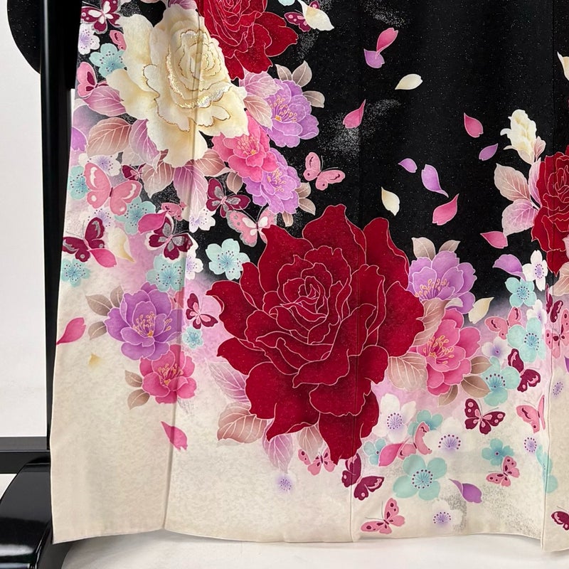 【振袖】 黒系 黒 秀品 B 約160cm~約169cm 裄丈69cm以上 (L)size 袖丈91cm以上 9990-29990 五万以下