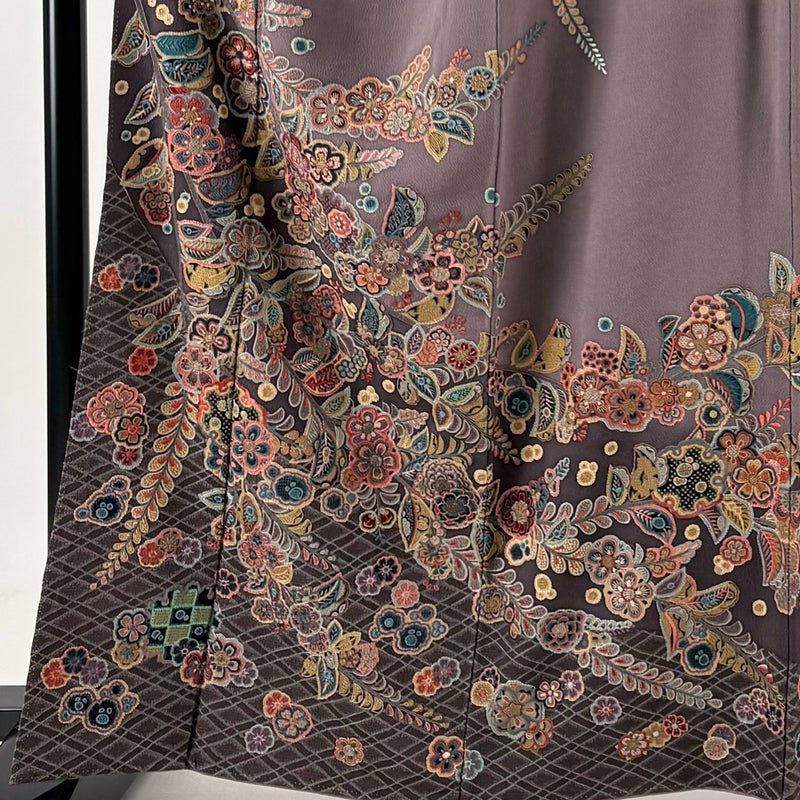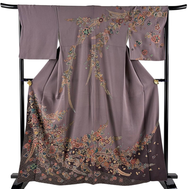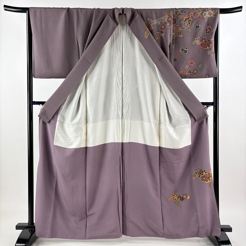 【着物ランク】名品 【素材】正絹 【身丈】約163.5cm 【裄丈】約66cm 【袖丈】約50cm 【袖幅】約34cm 【前幅】約25cm 【後幅】約31cm 【サイズ】M 【着物仕立て】袷 【着用時期】10~5月 【状態ランク】ランクB 【着物着用シーン】披露宴、パーティー、お見合い、式典、茶会