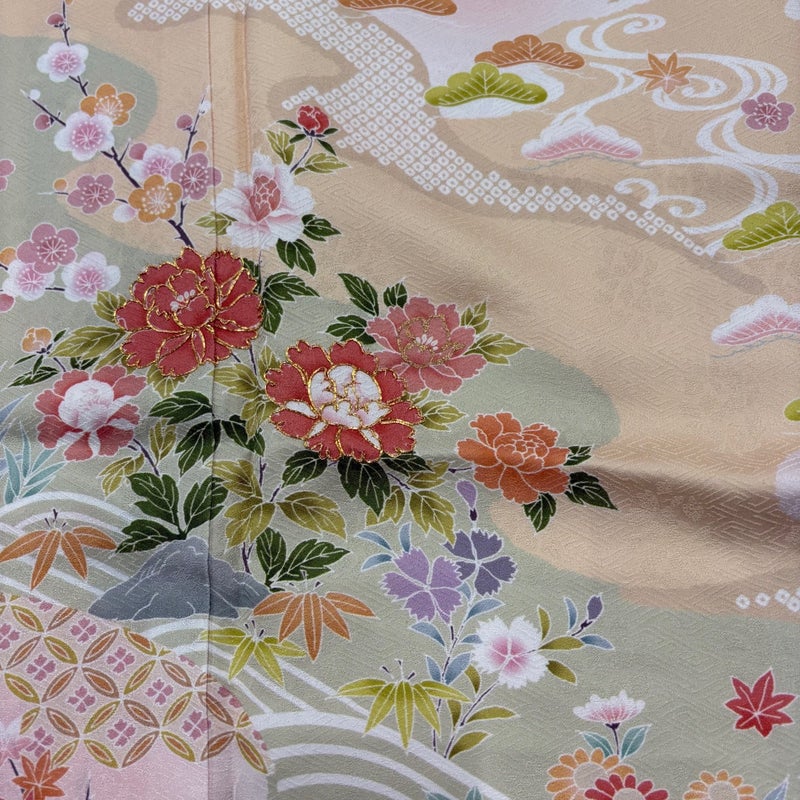 【着物ランク】名品 【素材】正絹 【身丈】約157.5cm 【裄丈】約67cm 【袖丈】約47cm 【袖幅】約34cm 【前幅】約24cm 【後幅】約30.5cm 【サイズ】M 【着物仕立て】袷 【着用時期】10~5月 【状態ランク】ランクB 【着物着用シーン】披露宴、パーティー、お見合い、式典、茶会