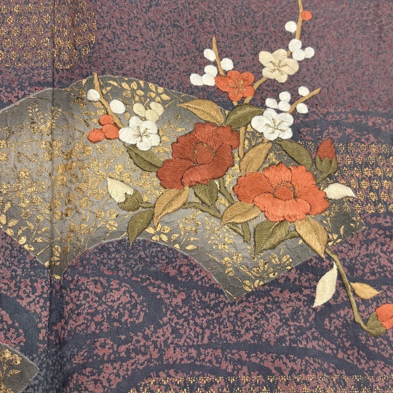 【着物ランク】秀品 【素材】正絹 【身丈】約159cm 【裄丈】約67cm 【袖丈】約48cm 【袖幅】約34cm 【前幅】約23.5cm 【後幅】約30cm 【サイズ】M 【着物仕立て】袷 【着用時期】10~5月 【状態ランク】ランクB 【着物着用シーン】披露宴、パーティー、お見合い、式典、茶会
