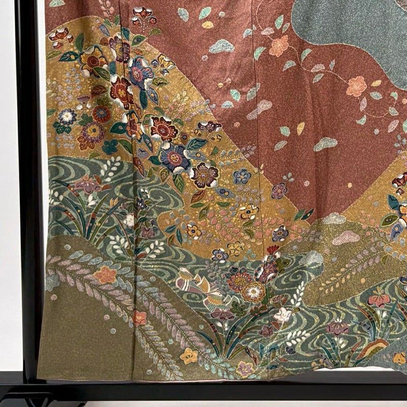 【着物ランク】名品 【素材】正絹 【身丈】約157.5cm 【裄丈】約63.5cm 【袖丈】約48cm 【袖幅】約32.5cm 【前幅】約24cm 【後幅】約28.5cm 【サイズ】S 【着物仕立て】袷 【着用時期】10~5月 【状態ランク】ランクC 【着物着用シーン】披露宴、パーティー、お見合い、式典、茶会