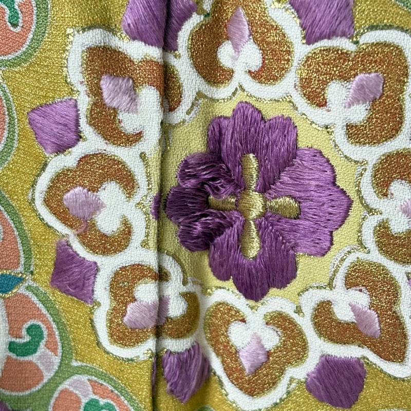 特殊な貝の色素から染め出した「帝王紫」という染料を用いた作品でございます。 帯次第で幅広くお使いいただける素敵な訪問着です。 帯により格式を変える事の出来る印象のお着物は、様々に場面で活躍してくれることでしょう。 身丈を+5.5cm程、現在の長さから伸ばせます。 裄丈はこれ以上伸ばすことができません。 衿周りや両袖口中に汚れ、下前の裾付近と後身頃の裾付近など所々にシワ、表地所々に金彩の剥がれや変色がございます。 胴裏にシワがございます。 リユース品としては良い状態で、まだまだご活用頂けると思われます。 ※なお、厳しく商品の状態確認を行っておりますが、記載の汚れ以外にも見落とし箇所がある可能性がある旨ご了承いただけますと幸いです。 沢山の商品の中からご覧いただき誠にありがとうございます。