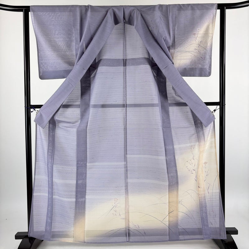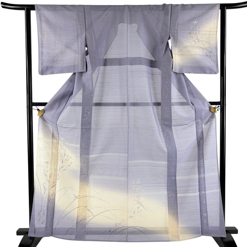 【着物ランク】名品 【素材】正絹 【身丈】約165.5cm 【裄丈】約62cm 【袖丈】約49cm 【袖幅】約32cm 【前幅】約23cm 【後幅】約29cm 【サイズ】S 【着物仕立て】薄物 【着用時期】7~8月 【状態ランク】ランクB 【着物着用シーン】披露宴、パーティー、お見合い、式典、茶会