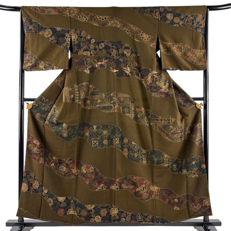 【着物ランク】逸品 【素材】正絹 【身丈】約158cm 【裄丈】約64.5cm 【袖丈】約48cm 【袖幅】約33.5cm 【前幅】約25cm 【後幅】約30.5cm 【サイズ】M 【着物仕立て】袷 【着用時期】10~5月 【状態ランク】ランクA 【着物着用シーン】披露宴、パーティー、お見合い、式典、茶会