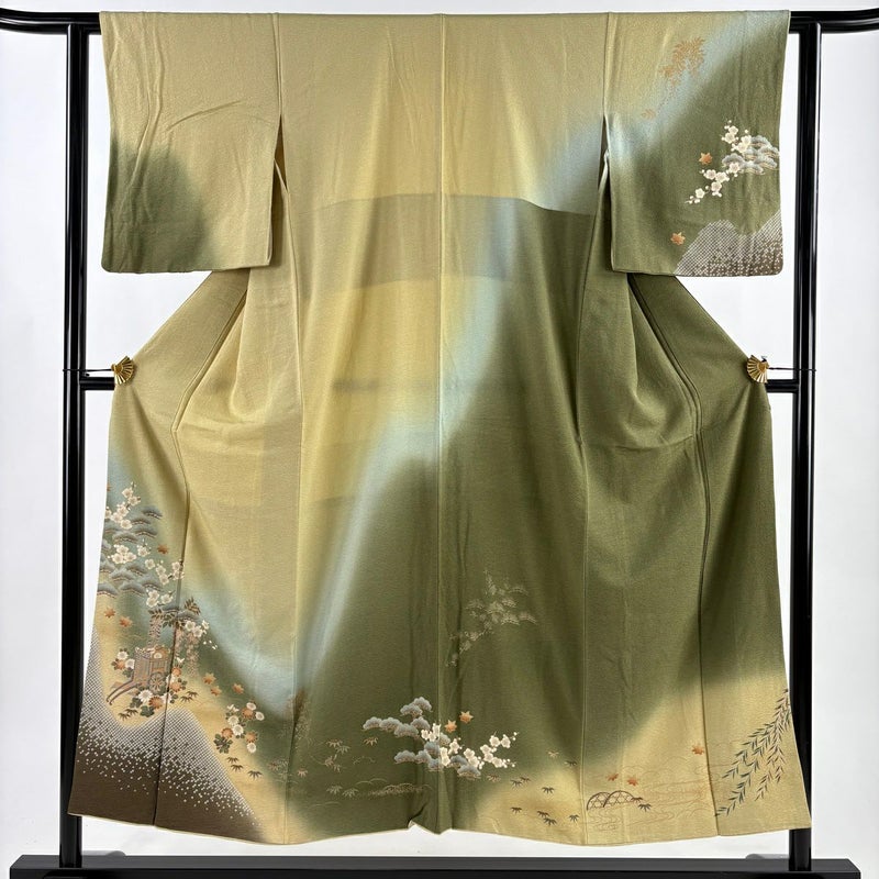 帯次第で幅広くお使いいただける素敵な訪問着です。 帯により格式を変える事の出来る印象のお着物は、様々に場面で活躍してくれることでしょう。 ※身丈・裄丈の縫込みの長さは測っておりません。 表地所々にヤケ、衿周りや両袖口中に汚れ、表地所々にシワ、表地所々に金彩の変色がございます。 裏地所々にシワ、裏地両脇に薄い汗シミがございます。 リユース品としては良い状態で、まだまだご活用頂けると思われます。 ※なお、厳しく商品の状態確認を行っておりますが、記載の汚れ以外にも見落とし箇所がある可能性がある旨ご了承いただけますと幸いです。 沢山の商品の中からご覧いただき誠にありがとうございます。