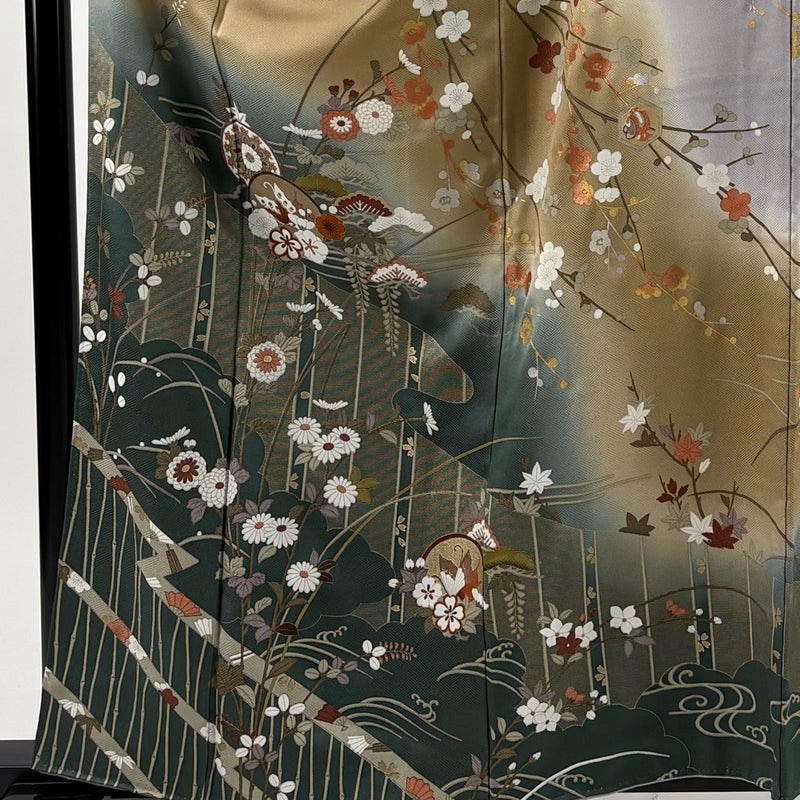 【着物ランク】秀品 【素材】正絹 【身丈】約161cm 【裄丈】約65cm 【袖丈】約48.5cm 【袖幅】約33cm 【前幅】約25cm 【後幅】約30cm 【サイズ】M 【着物仕立て】袷 【着用時期】10~5月 【状態ランク】ランクB 【着物着用シーン】披露宴、パーティー、お見合い、式典、茶会